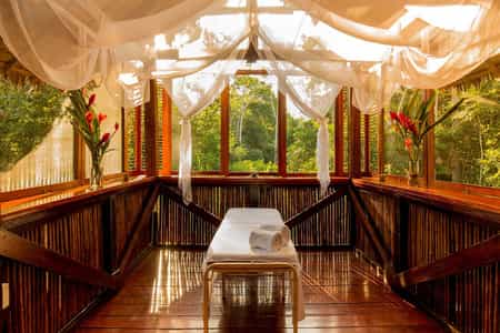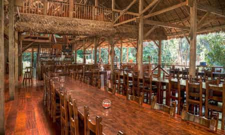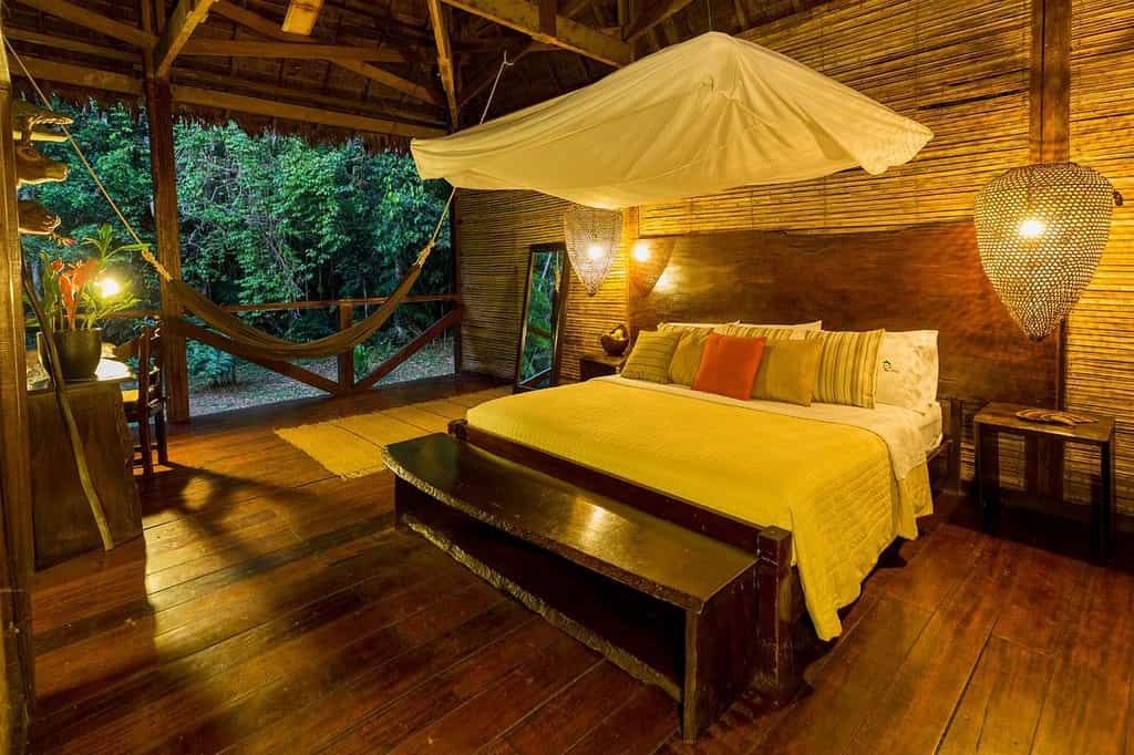 Like in other Rainforest Expedition hotels, rooms have an open wall facing the jungle for a true glamping feel. The plush beds have heavy duty mosquito nets and the ensuite bathrooms offer eco-friendly toiletries and hot showers (although a cold shower isn’t too bad in the humid heat!). Electricity runs on set time blocks until 10pm, while only comfort and suites have WiFi (weather permitting). The in-room hammock is a dreamy spot for a siesta, while nocturnal nature sounds are a privileged soundtrack to fall asleep to.