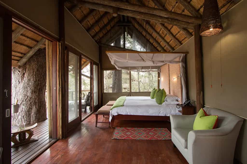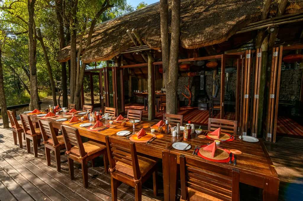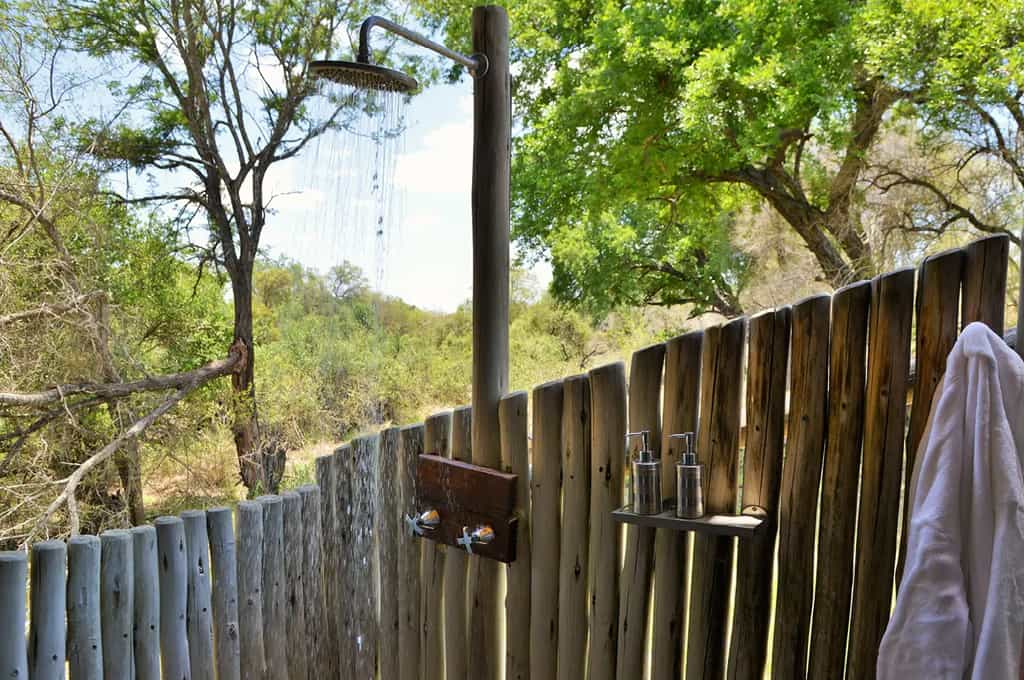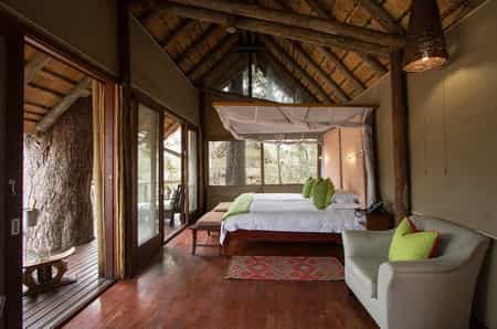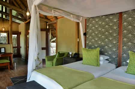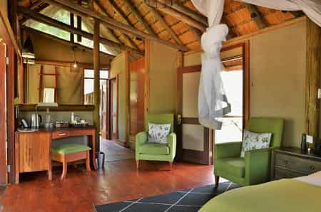 There are 8 luxury suites sleeping up to 16 guests. The suites are elegantly decorated and have an open plan style with wooden floors, thatched roofs, and canvas walls. They are raised with stilts allowing amazing views of the riverbed from the bathroom, the outdoor shower and the patio deck. The en-suite bathrooms have deep, freestanding baths, dual wash basins, and outdoor showers. The bathroom floor is attractively decorated with delicate mosaic designs.
