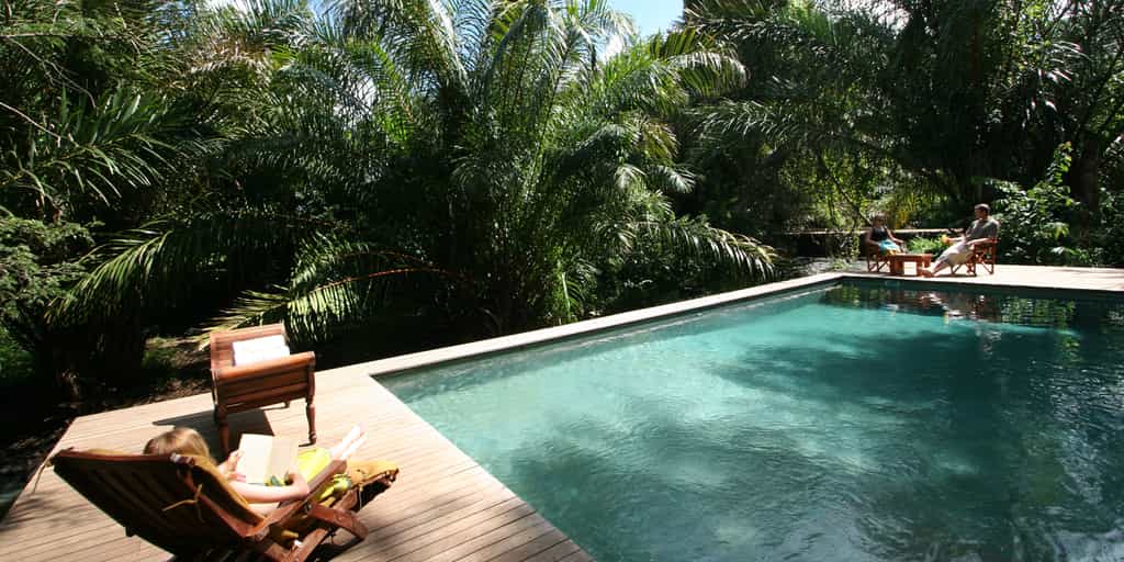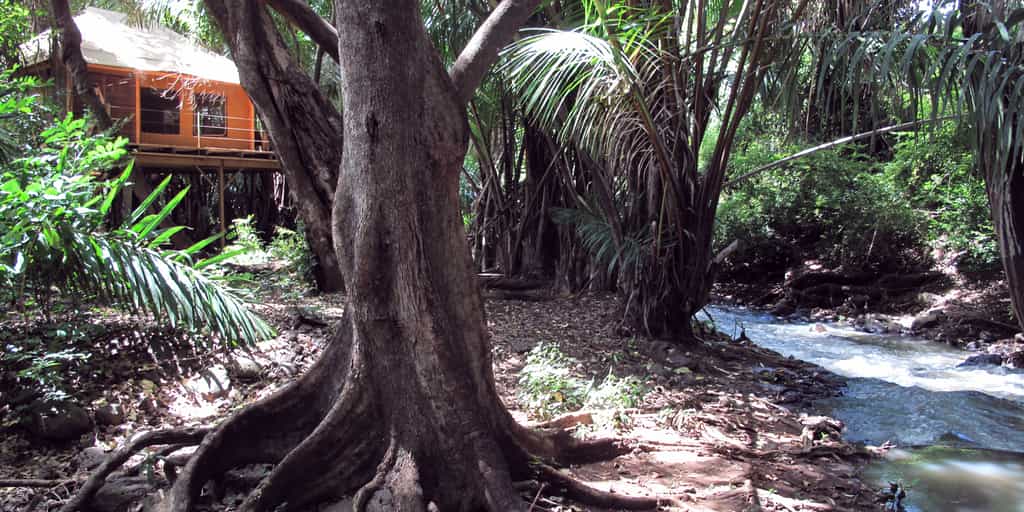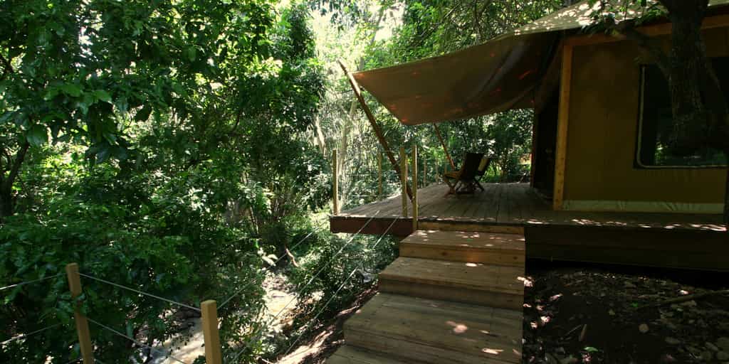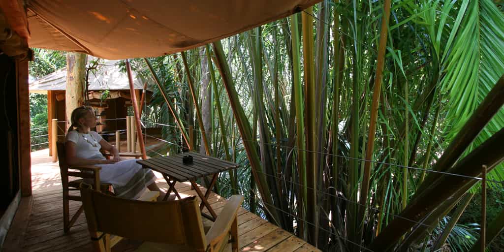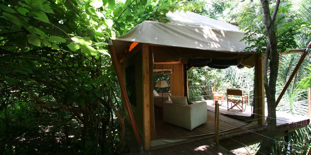 Tucked among the trees, the six private tented rooms are accessed by elevated walkways through the canopy. Each has a broad deck overlooking the river, with a private 'zen area' extension that's ideal for enjoying the silence and sights. Inside, the rooms are spacious, with wooden floors, queen-sized beds, and en-suite bathrooms with shower, toilet and basin. Decor is simple – crisp white linens and subtle African prints; the luxury comes through in the clever architecture and attention to detail.