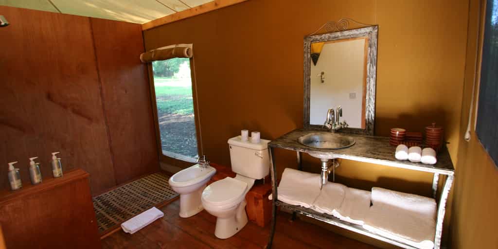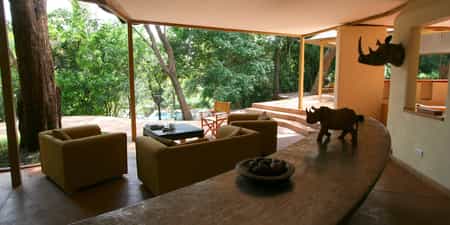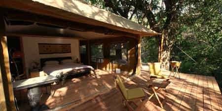 The camp's structures are all elevated on wooden platforms, giving it a distinct treehouse feel. A furnished deck flows into the central lounge (where sand-cushioned seating invites a lazy afternoon with a good book) and dining area, both covered with stretched canvas. There's a bar, with cowskin-covered stools fronting its broad, beaten-metal countertop. The highlight of the main area is the pretty swimming pool, set in a dense thicket of indigenous woodland beside a small stream. Perfect calm...