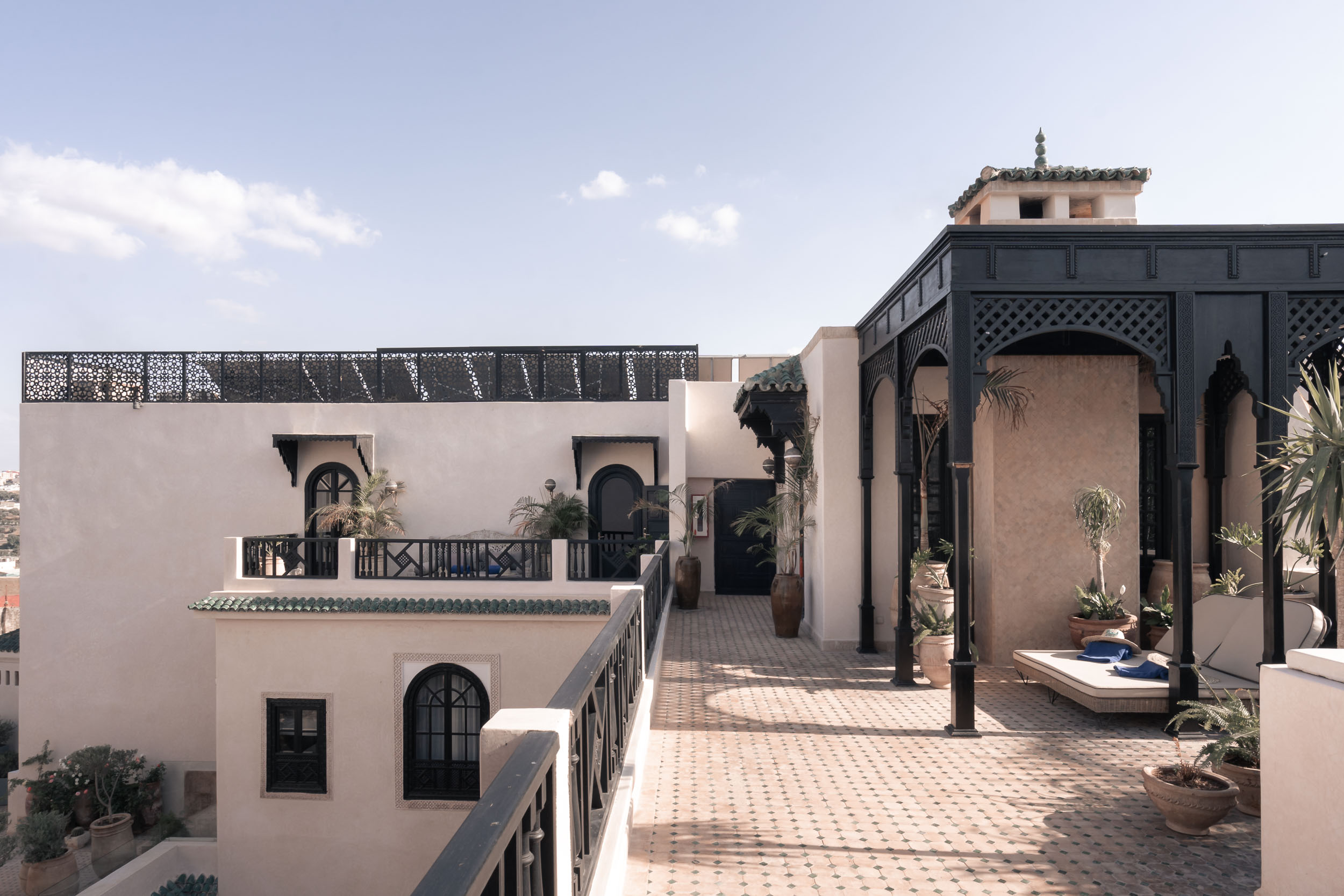 The rooms retain a rich, classic style with zellige floors, Carrara marble bathrooms (with African black soap and clay for your own 'spa' treatments), and Moroccan antiques. Suites are especially lovely and are adorned with crystal chandeliers on finely-carved ceilings and hand-chiseled stucco walls. Most also have a private terrace overlooking the medina. Each room has a sitting area with a satellite TV, Nespresso machine, and a minibar. La Royal Suite is the most extravagant and far more spacious than most in Fez.