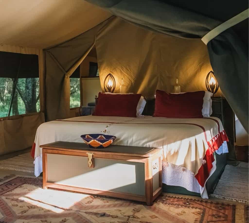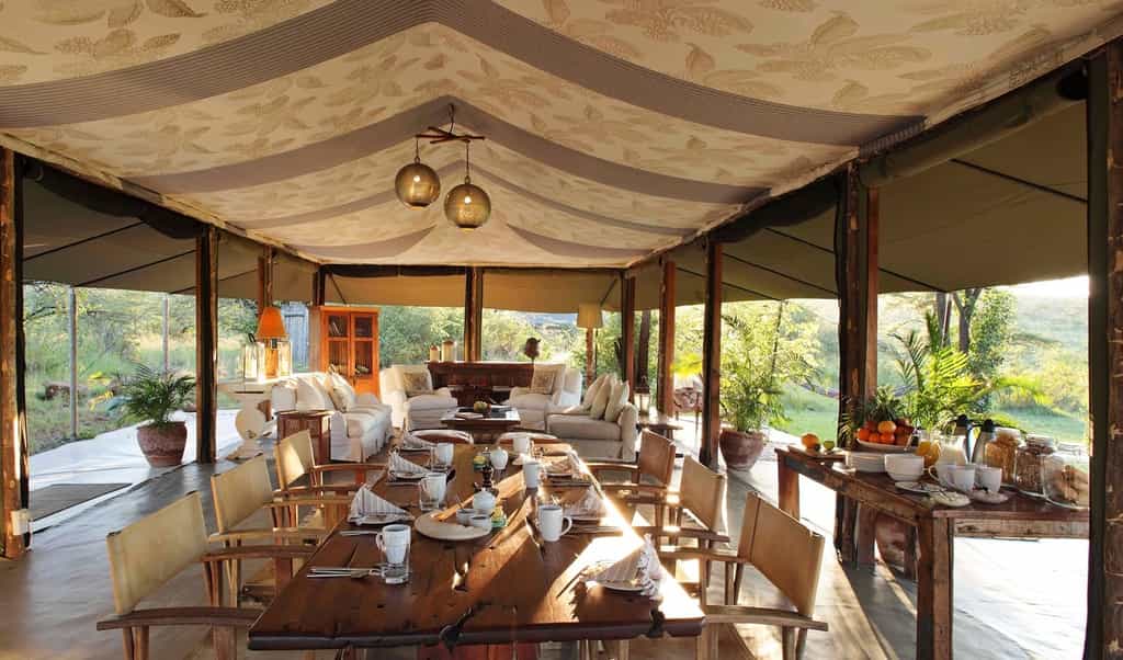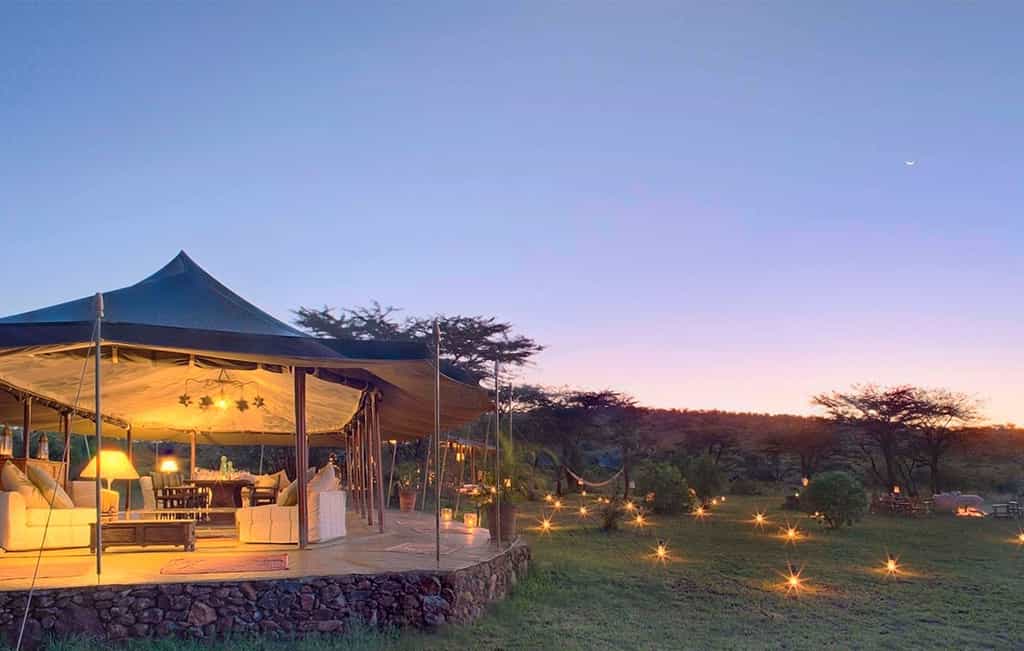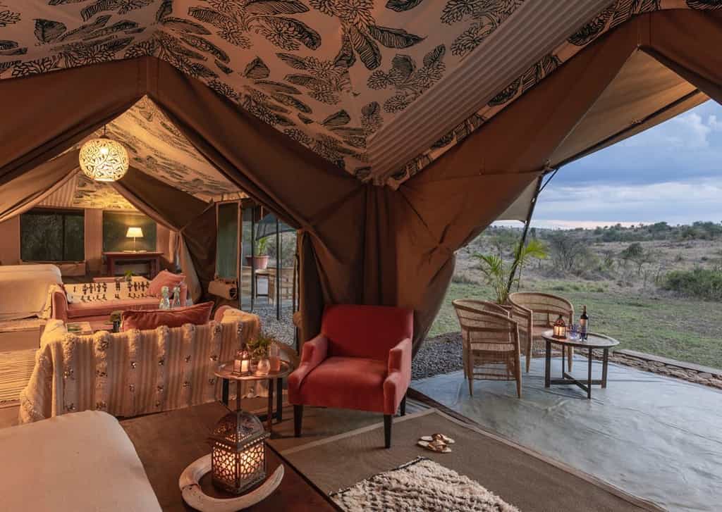 Raised up on a stone-masoned platform, the open sided main dining and lounge tent rises up over the Mara plains like a boutique sail boat floating over the grasslands. Effortlessly beautiful cream sofas make the most of the views, while textured rugs and local artefacts (many of which have been collected by Liz on her worldly travels) hark back to safari adventures of old. Dining is done either under the canvas, or more likely, out in the bush under the stars. Magical.