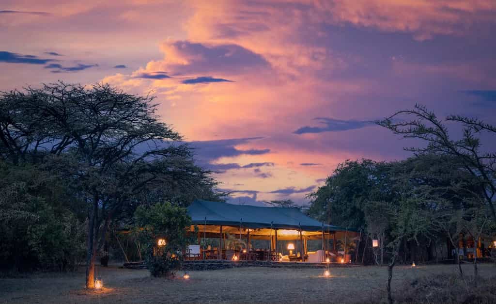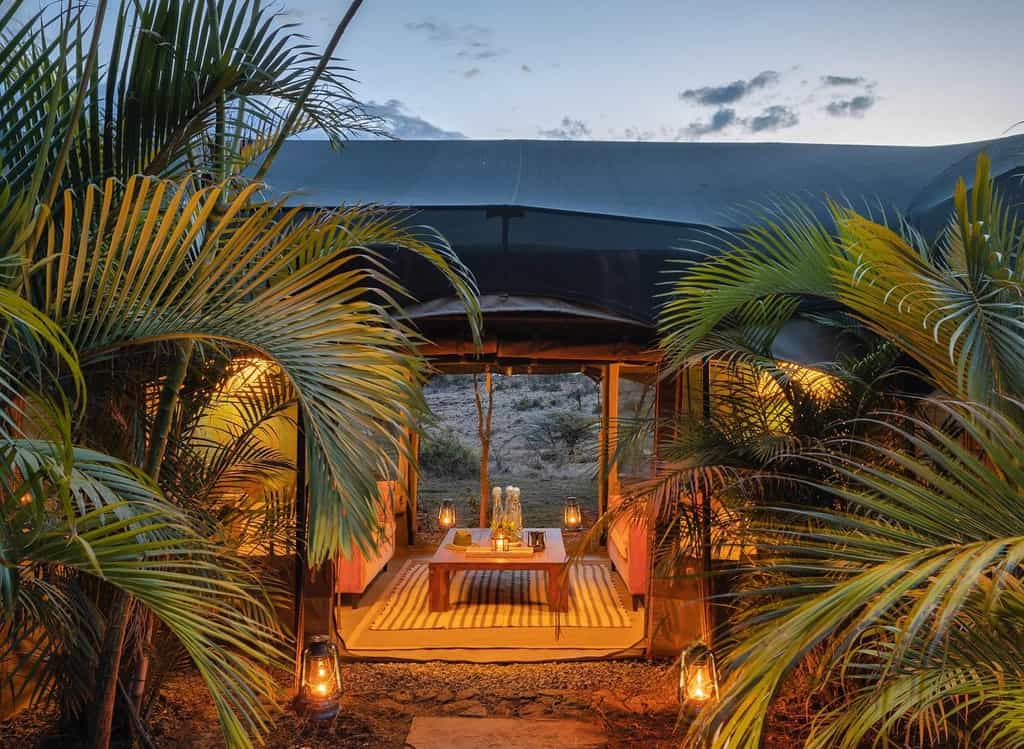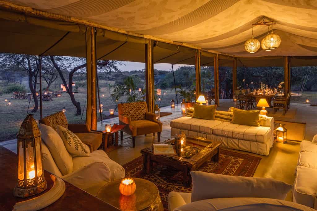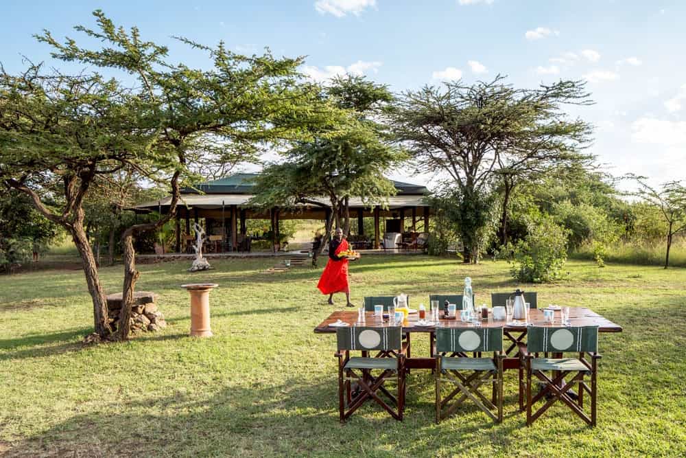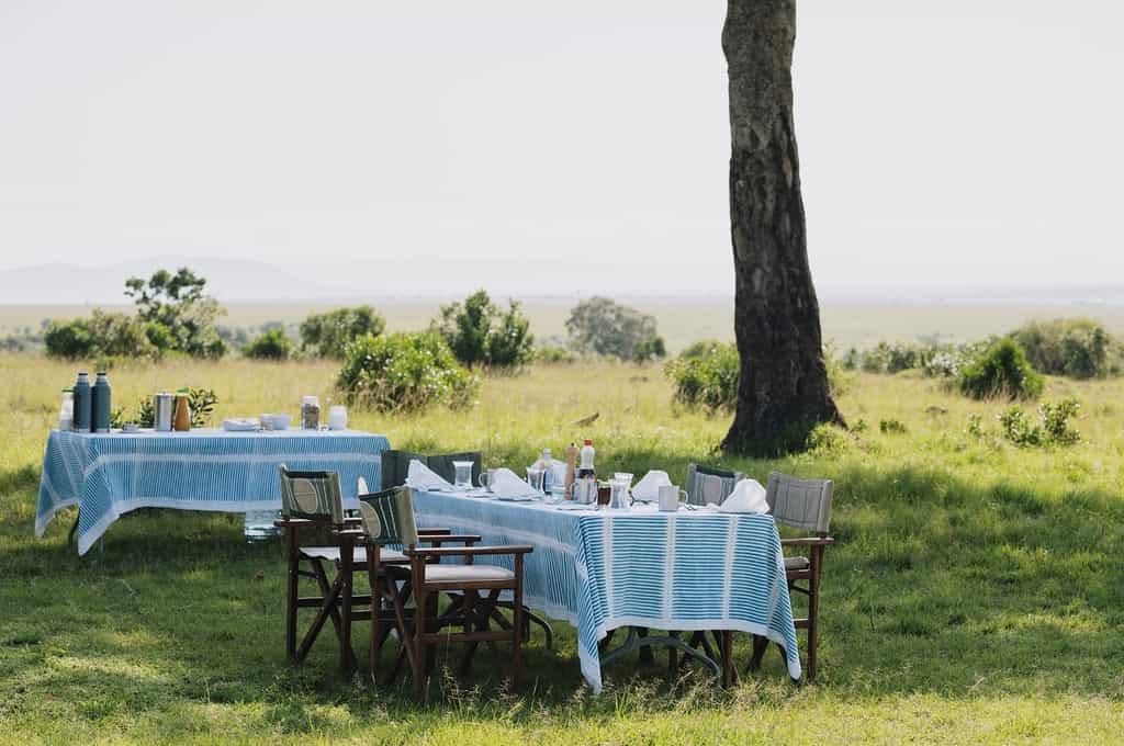 Raised up on a stone-masoned platform, the open sided main dining and lounge tent rises up over the Mara plains like a boutique sail boat floating over the grasslands. Effortlessly beautiful cream sofas make the most of the views, while textured rugs and local artefacts (many of which have been collected by Liz on her worldly travels) hark back to safari adventures of old. Dining is done either under the canvas, or more likely, out in the bush under the stars. Magical.