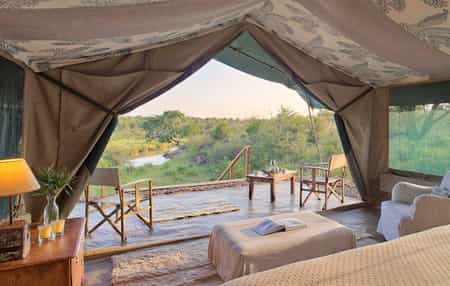Seven exquisitely decorated tents are scattered in intimate zones around the camp. They're chic, but still charmingly rustic: think richly-weaved arabesque carpets mingling with ancient, carved chests, and complemented by soft linens in neutral shades. Even the tent itself is a beautiful, contemporary patterned canvas. The ensuite bathroom with flush loo and heated shower is framed by wall of bamboo - Robinson Crusoe's dream bathroom indeed! And at the front of each is a small sitting area with safari chairs, ideal for admiring the passing wildlife.