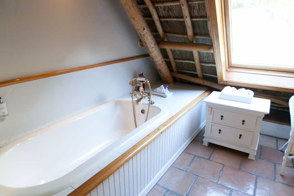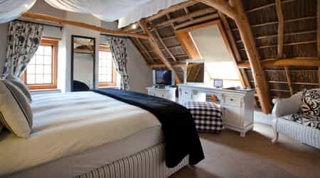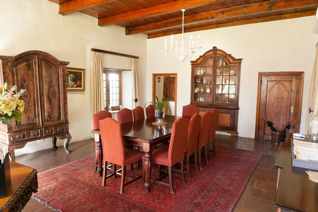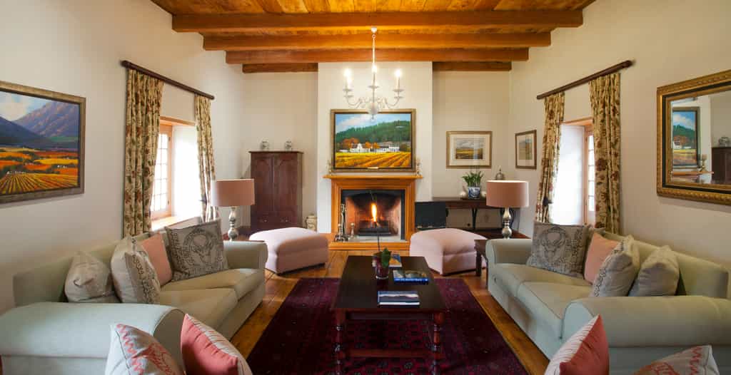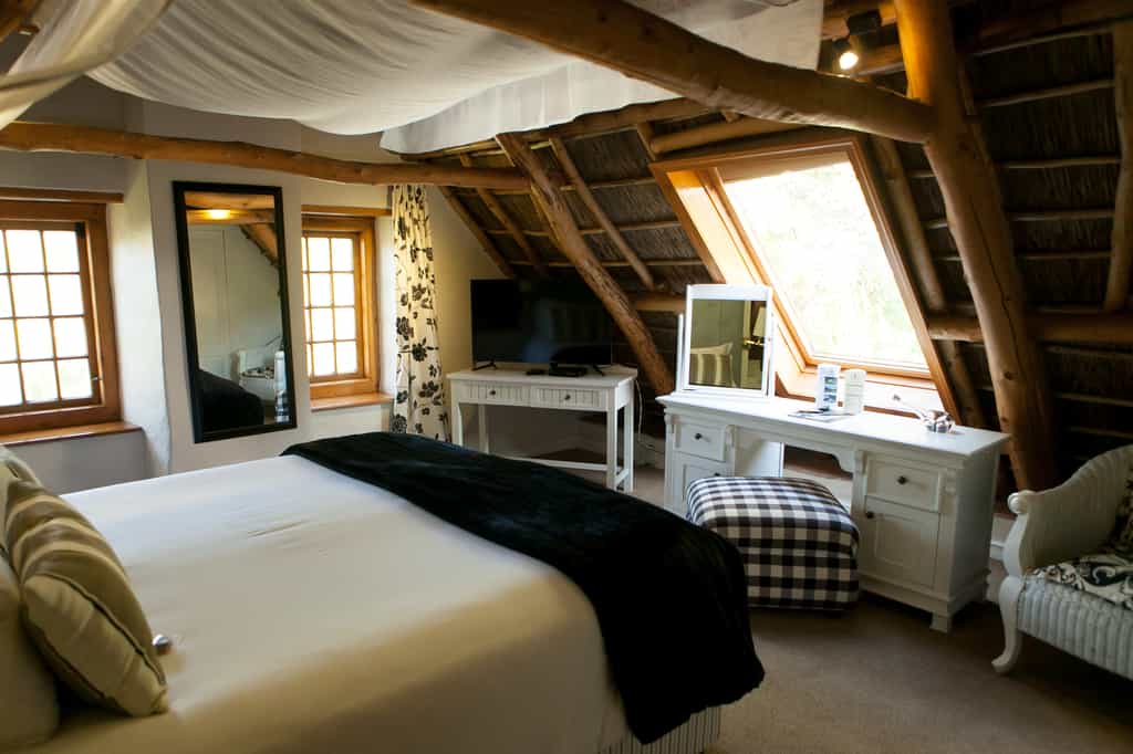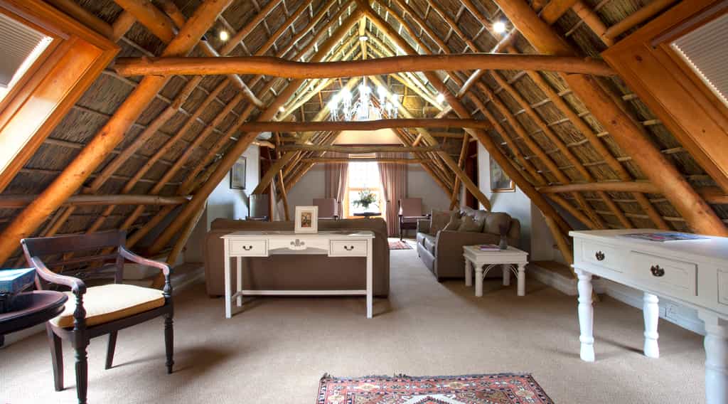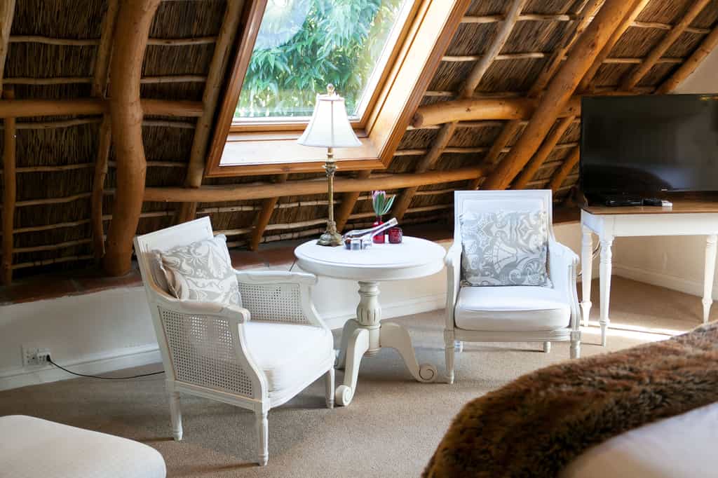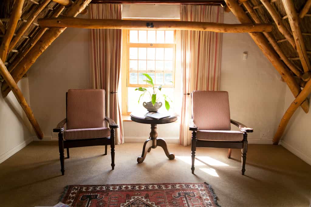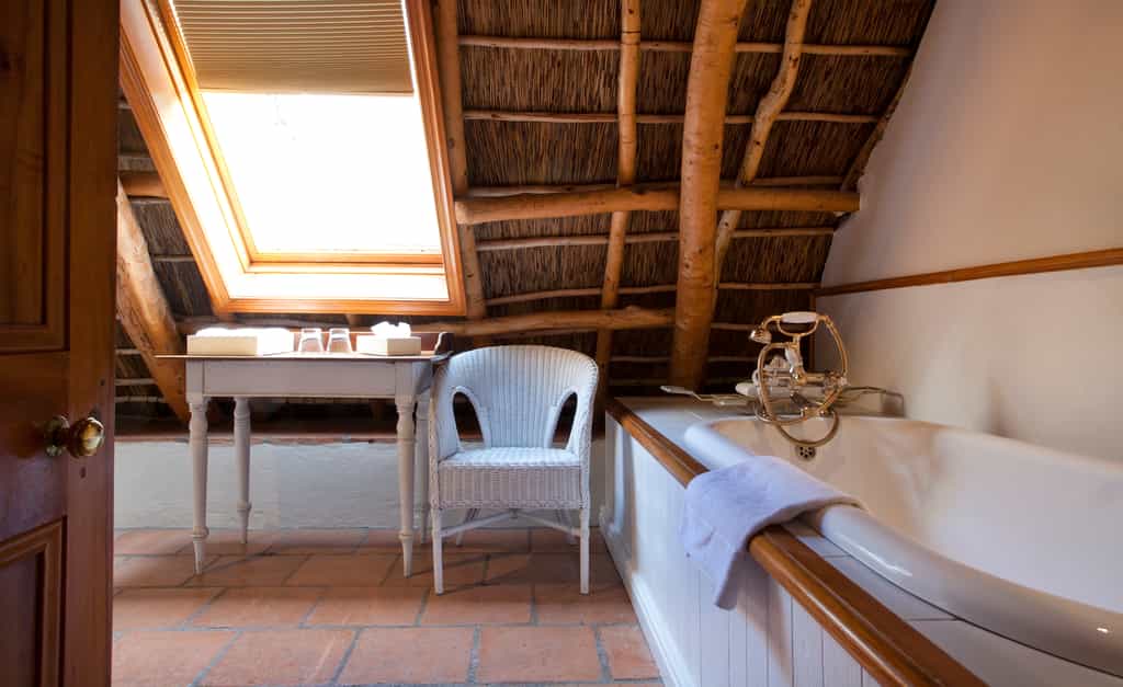 The trio of luxurious guest rooms (one on the ground floor, two upstairs) each have a unique style that blends Cape Dutch vintage furnishings with contemporary decor, including deliciously modern touches like underfloor heating, satellite television, minibars and tea- and coffee-making facilities. All have en-suite bathrooms with huge bathtubs and separate showers. The upstairs suites are particularly charming, set cosily beneath the thatched eaves, with glowing timber beams, and beautiful views of the mountains.