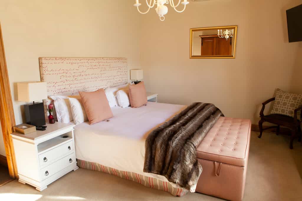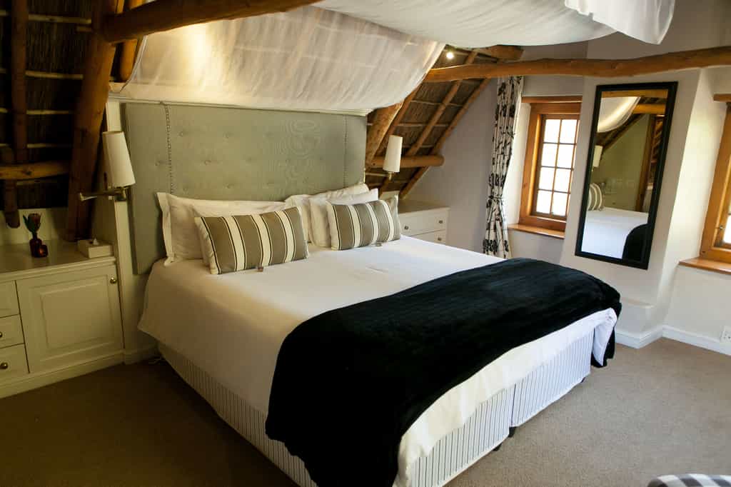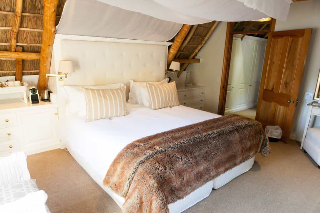 The thatched manor house has retained its traditional Cape Dutch feel, with original exposed yellowwood ceilings and polished Oregon pine floors adding rustic warmth and a sense of cherished history. There are two guest lounges with comfortable couches and open fires, and a quaint breakfast room alongside the country kitchen. On warm summer mornings, breakfast is served outside on the terrace or next to the swimming pool, and we recommend you head to Paulina’s restaurant for lunch. Free wi-fi.