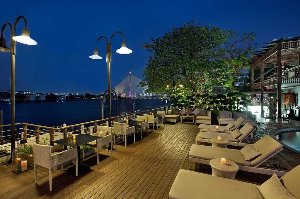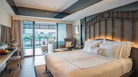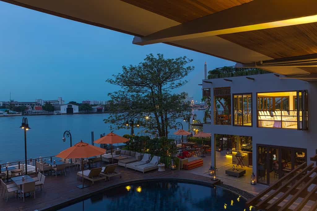 Gazing across the river, there is a lovely pool lined with shaded loungers where you can indulge in a massage. Head inside and you'll find the hotel's restaurant, Babble & Grill, which serves a medley of Thai and Western cuisine with stand-out dishes like the deep-fried sea bass with sweet chilli sauce or 12-hour smoked beef brisket. You can also dine on the terrace, which enjoys views of the historic Rama VIII Bridge, or grab a cocktail at the Riverside Bar.