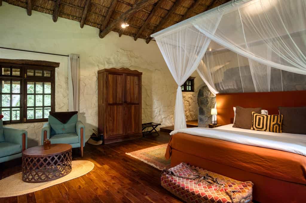 There are 38 spacious rooms - garden or farm house, two intimate cottages (with outdoor rain showers) and the River House for small groups (ideally two couples). All are kept to reasonable standards with twin or four-poster beds, white linen and hanging mosquito nets. An en-suite bathroom, writing table and cosy chairs ensure your comfort. As the price increases, so does the level of luxury – the River House comes with a wraparound veranda for private dining, and satellite TV.