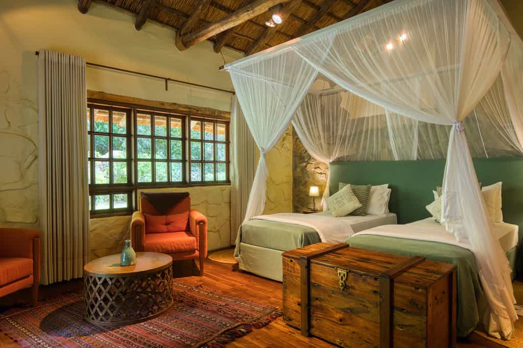 Originally a B&B, Rivertrees farmhouse now houses four rooms and the communal areas – the lounge in the original, now refurbished, building and the dining and bar space in a separate, thatched and open-sided structure. The lodge is decorated with well-cared-for family antiques alongside stylish and comfortable chairs and sofas. The food is excellent and garden-fresh (the pizzas are hightly rated). And there's a pool to wallow in to escape the African heat and the massage hut sees to any pampering.
