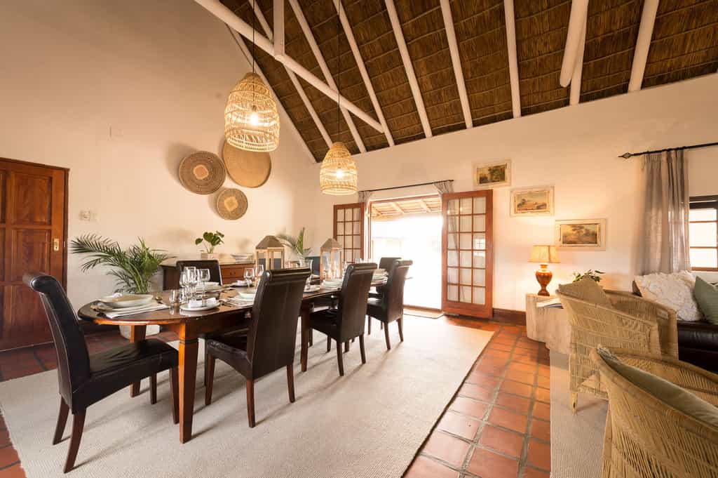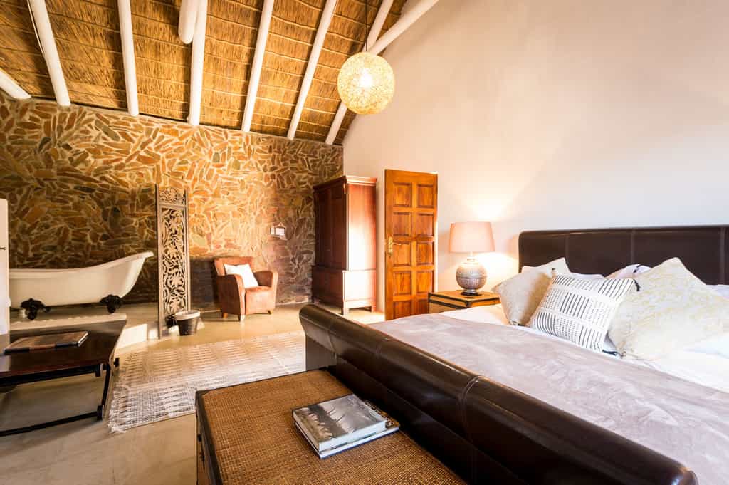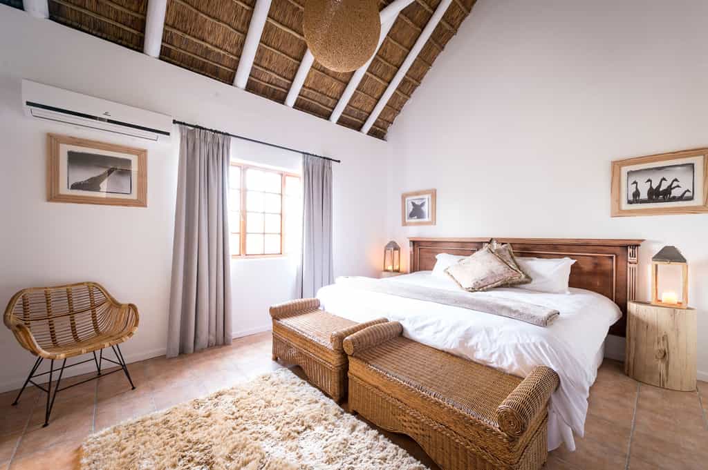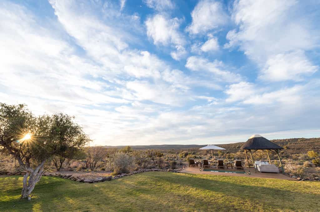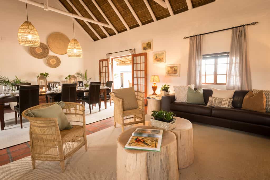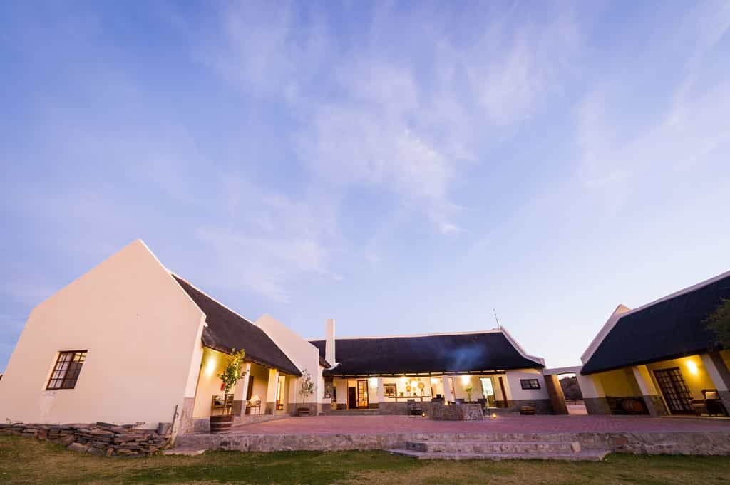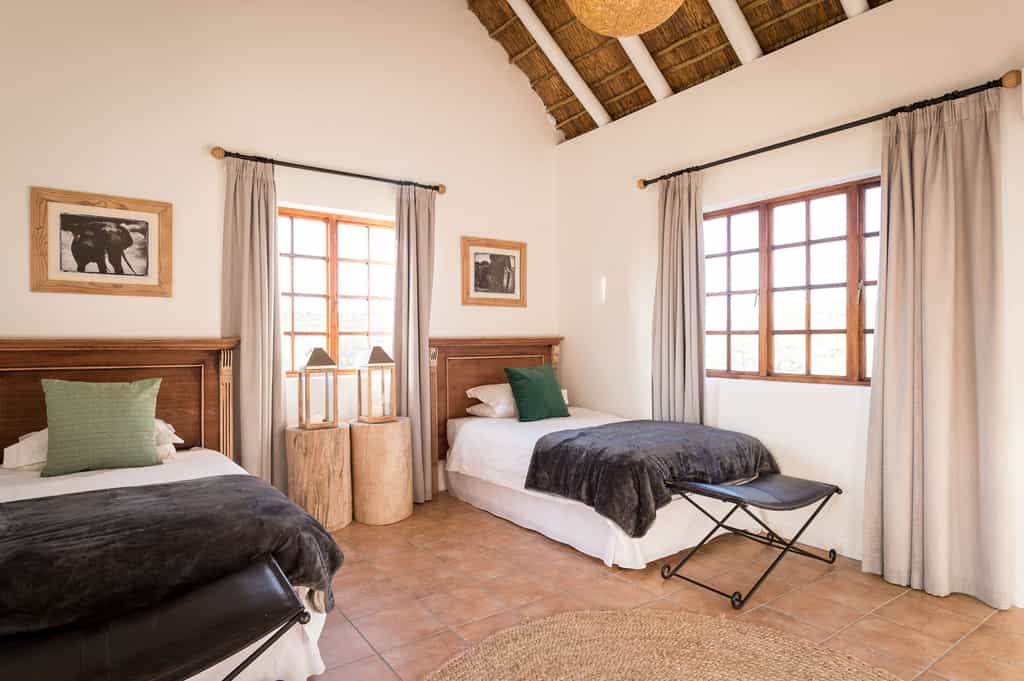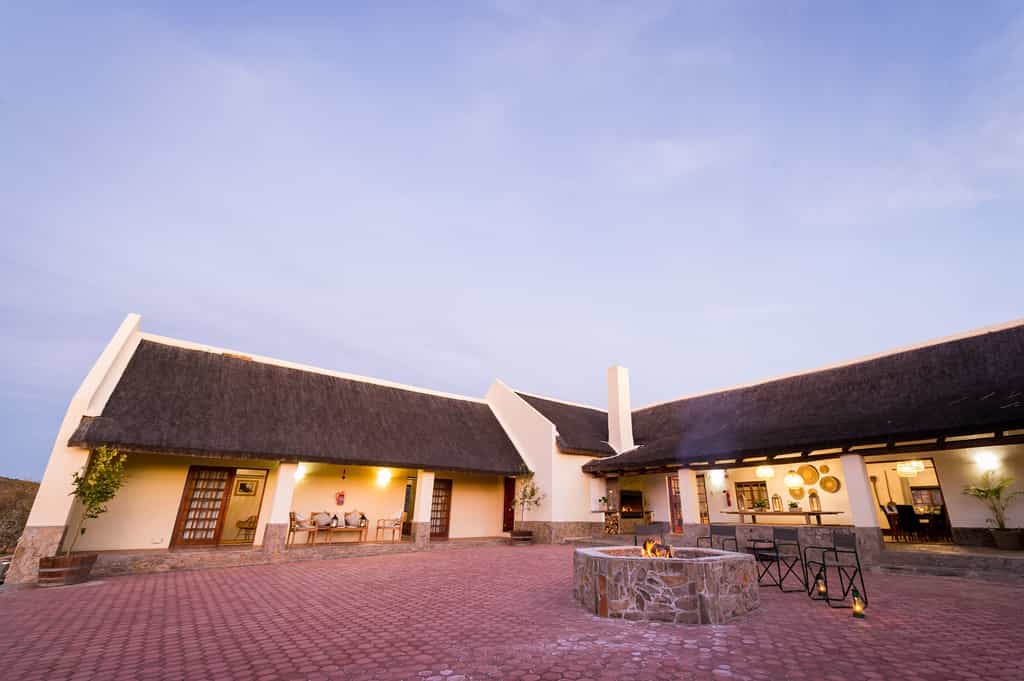 The lodge comprises three large thatched buildings built in a horseshoe around a courtyard. The architecture replicates that of old Karoo farmhouses, with high ceilings, white-washed walls and deep verandas with plentiful outdoor seating, and a long wooden table set facing a stone braai area. Beyond the lawn, a wooden deck surrounds a pool, and shaded seating offers front-row rugged views. Indoors, two lounges offer ample seating, and there's a communal dining area. Expect country-style hospitality at its best.