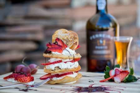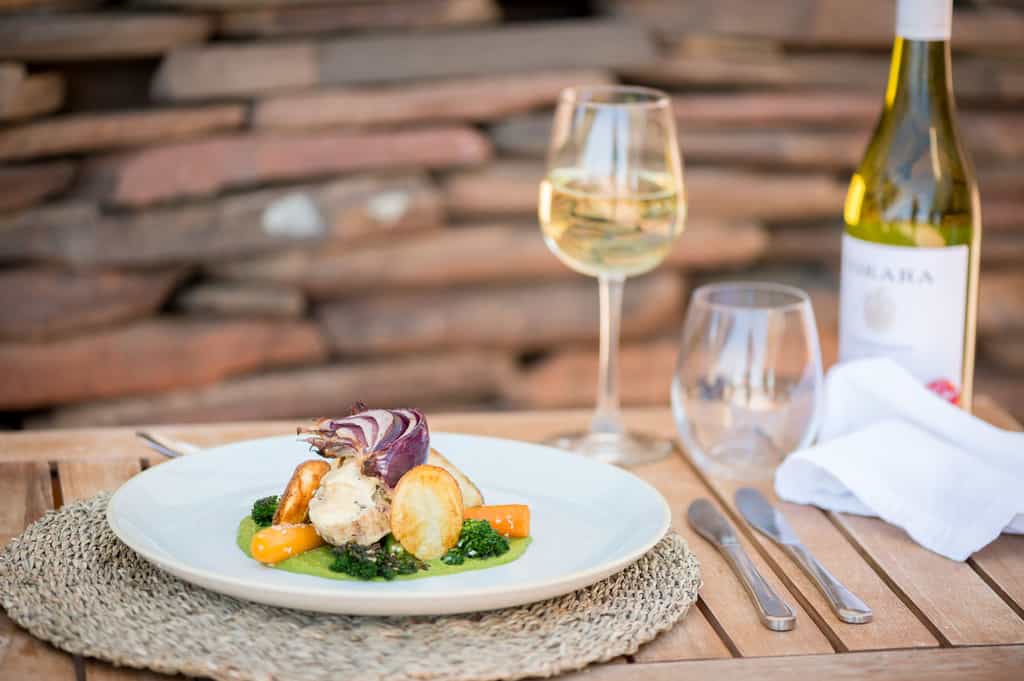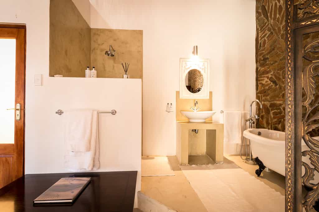 The two buildings flanking the main area house five bedrooms – one twin, three doubles and one master suite. They too are finished in Cape Dutch/Karoo style, with thatched ceilings and polished concrete or tiled floors, deliciously cool underfoot in summer. The furnishings are simple but elegant, and very comfortable. En-suite bathrooms (some completely open to the bedrooms) have large showers; the master suite has a Victorian tub. Each room opens to the courtyard and has a terrace with seating.