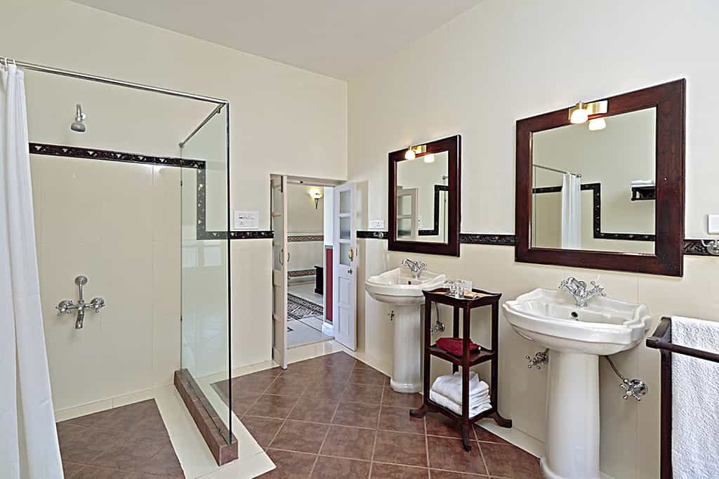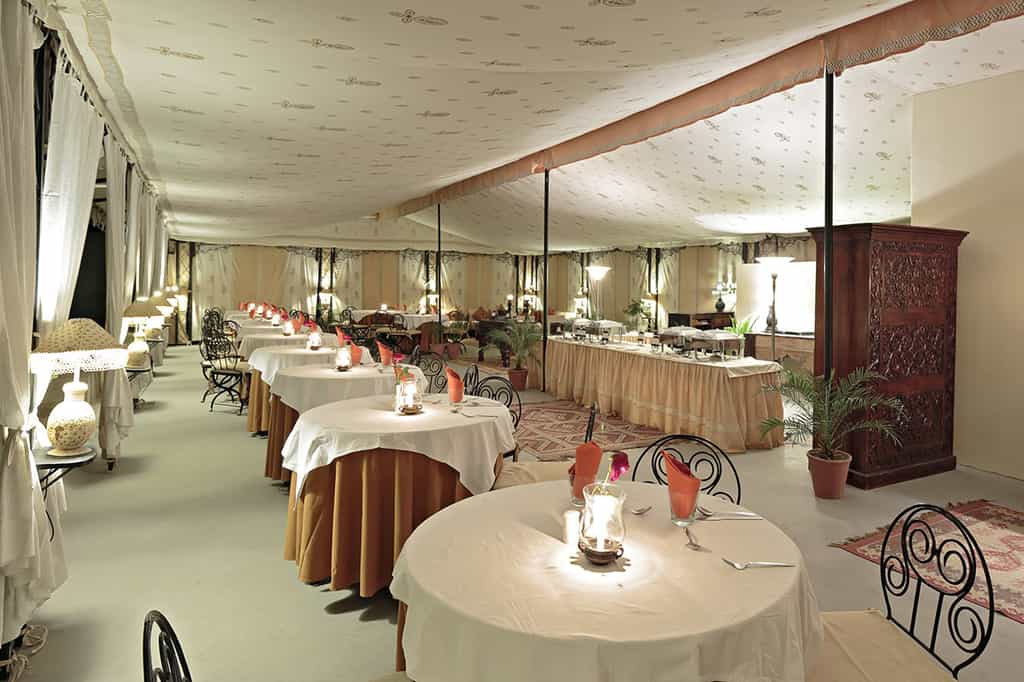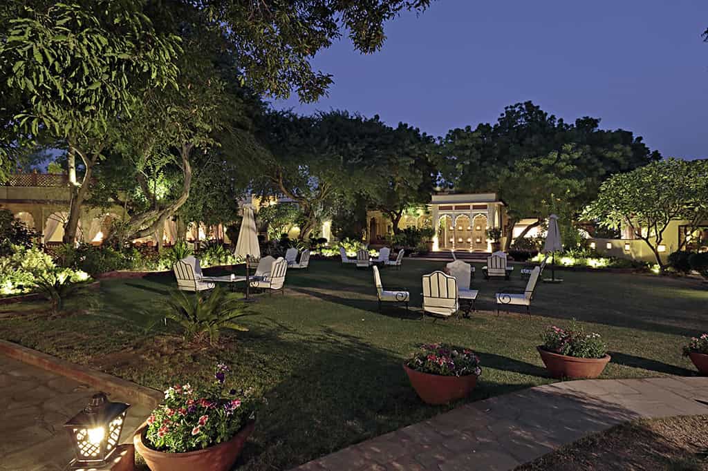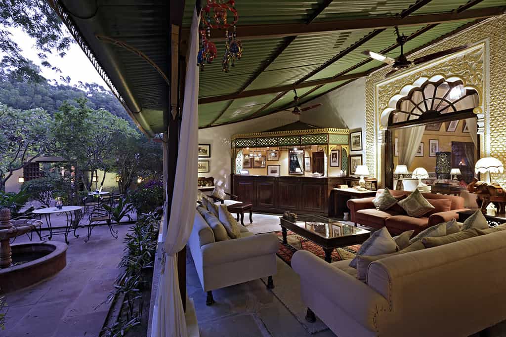 Rohet Garh is well laid out with a shimmering pool alongside a canopied dining area, which serves traditional Rajasthani cuisine. You can also enjoy a meal beneath the trees in the courtyard or dine with a lake view on the patio. Tattva Spa offers a variety of therapies from a deeply relaxing full-body massage to reflexology. Enjoy a drink at the eclectic bar, afternoon tea in the drawing room, or while away the afternoon on a daybed under a floaty gazebo.