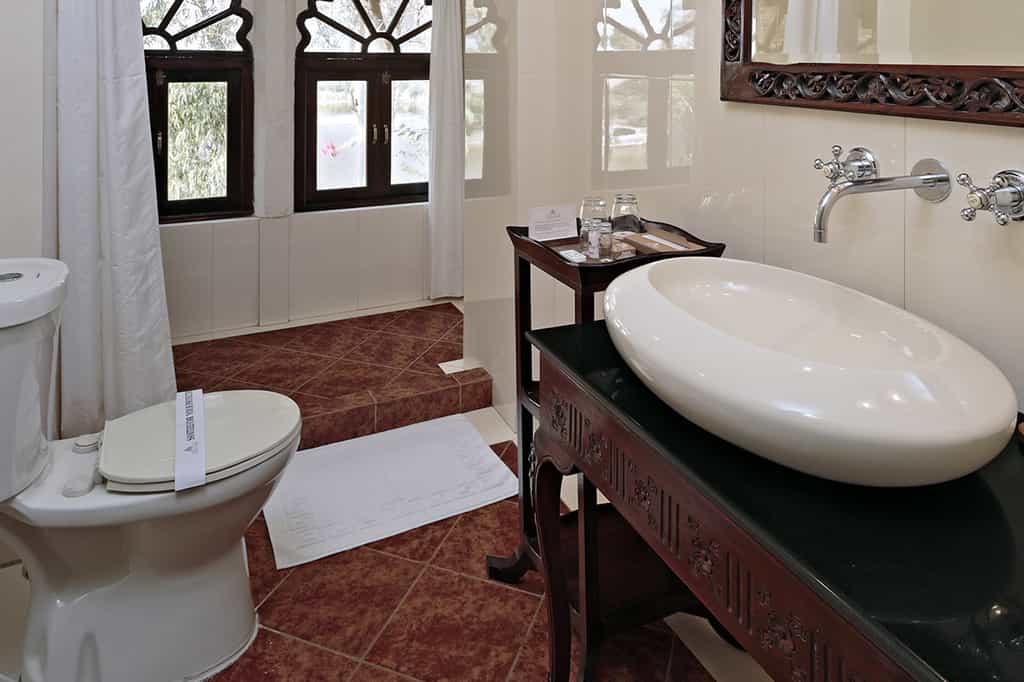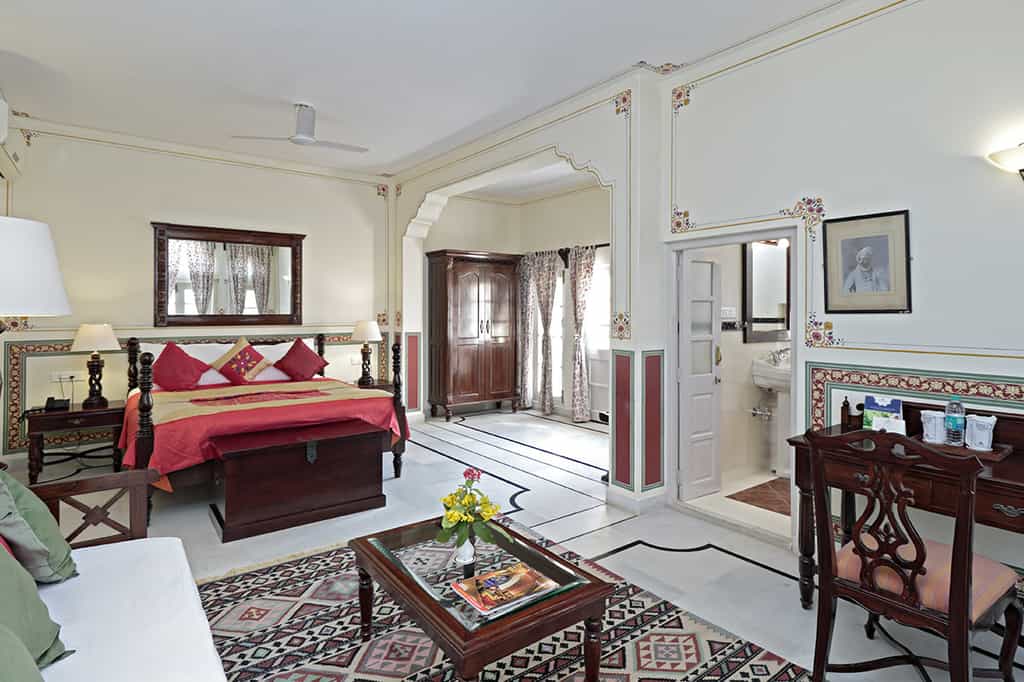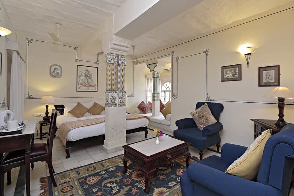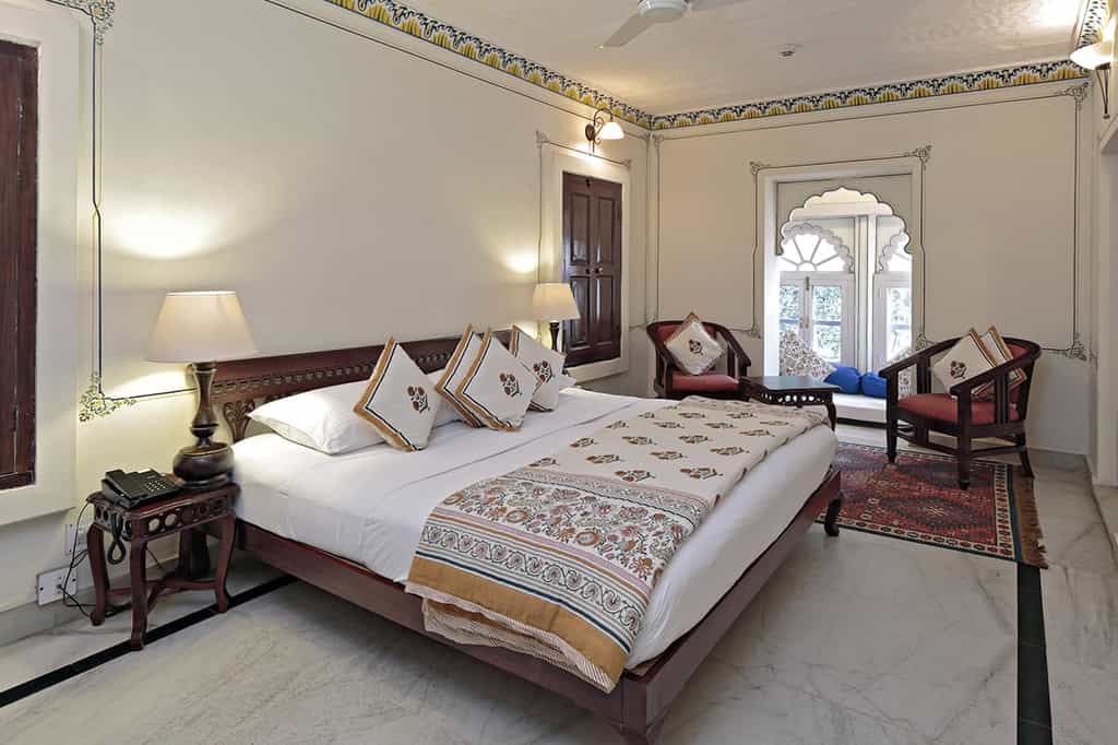 The hotel has 30 Deluxe Rooms and six suites, each with its own bespoke design. Amenities include a desk, en-suite bathroom, double or twin beds and furniture designed in-house. Decked out in traditional motifs and patterned rugs, the Deluxe Rooms come with a window seat and living area; while the suites have a large lounge area and double basins. Some suites also have a private patio and four poster beds with delicate drapes.