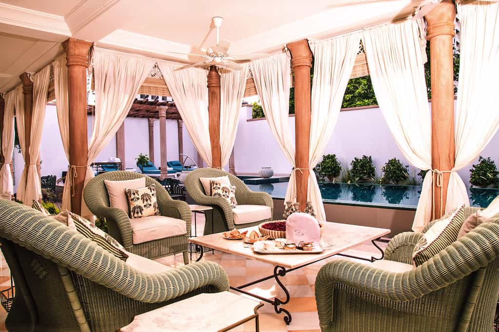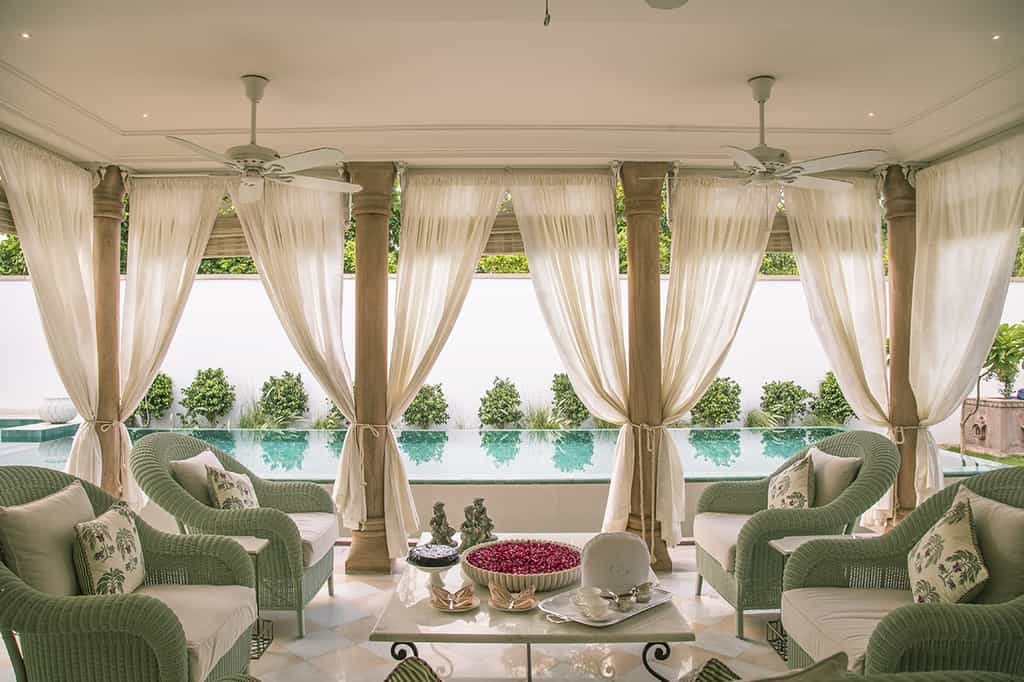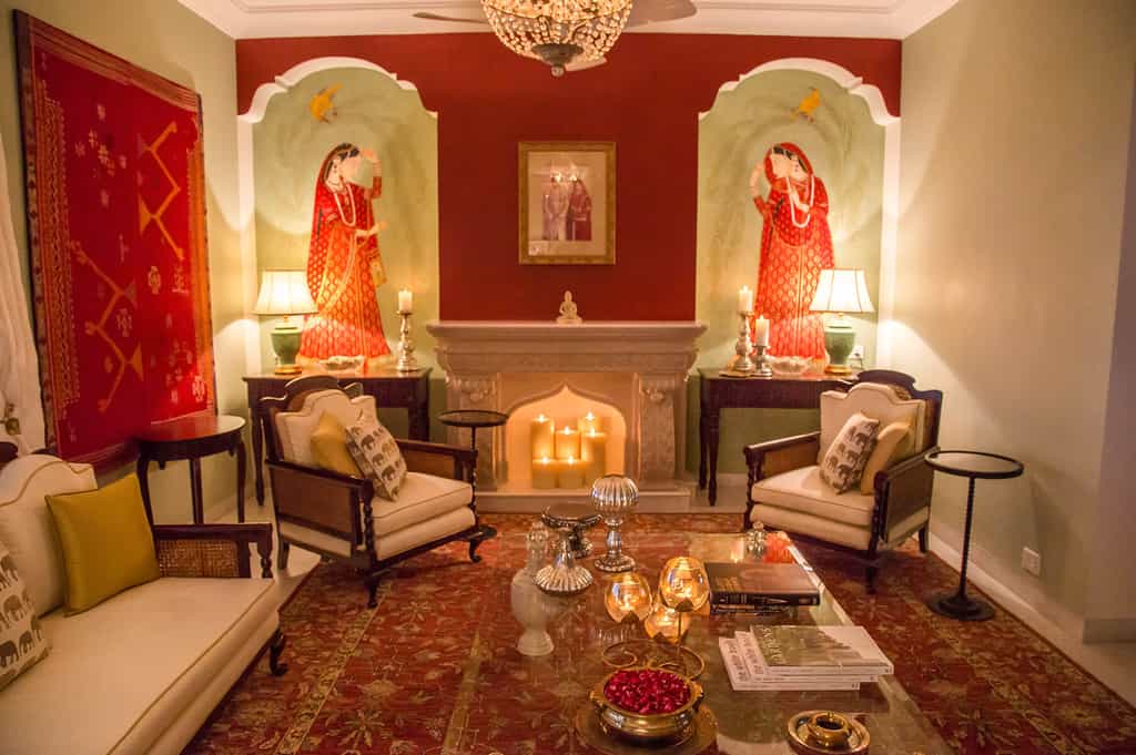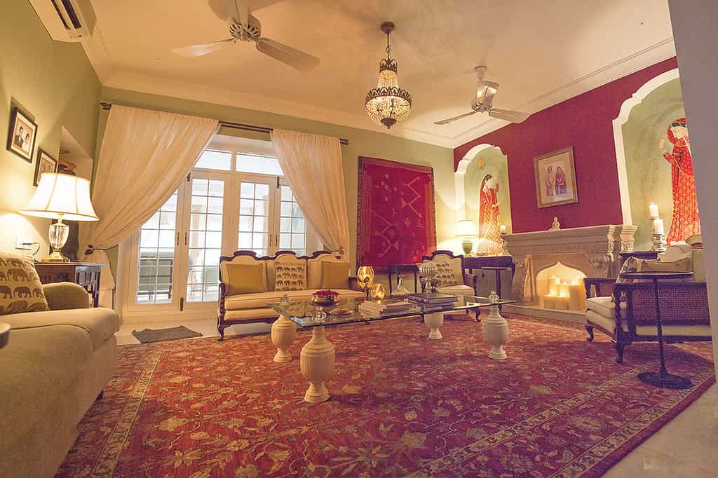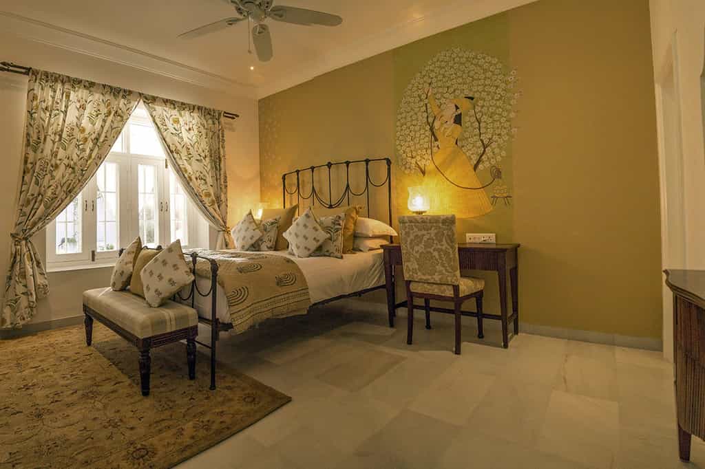 At Rohet's centre is a cosy lounge with rich carpets, chandeliers filling the room with soft light and an ornate fireplace. It's the perfect place for a night cap with the family, hearing stories about the portraits dotted throughout the house. In the airy dining room complete with elephant murals, tuck into meals straight out of the family's personal kitchen, including the infamous Rajasthani thalis. Time outside can be enjoyed with High Tea on the blush-coloured veranda, a dip in the oh-so-inviting pool or drinks by the fire pit.