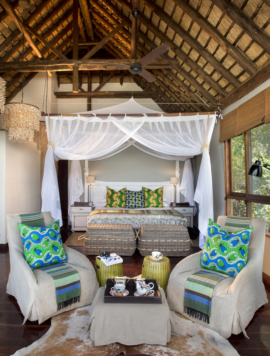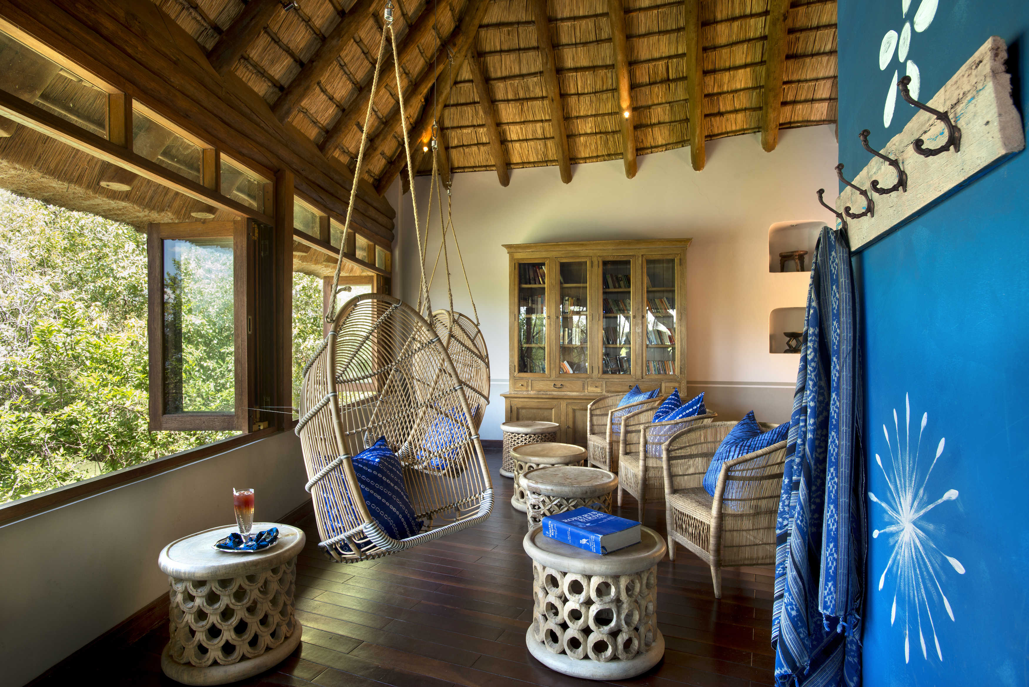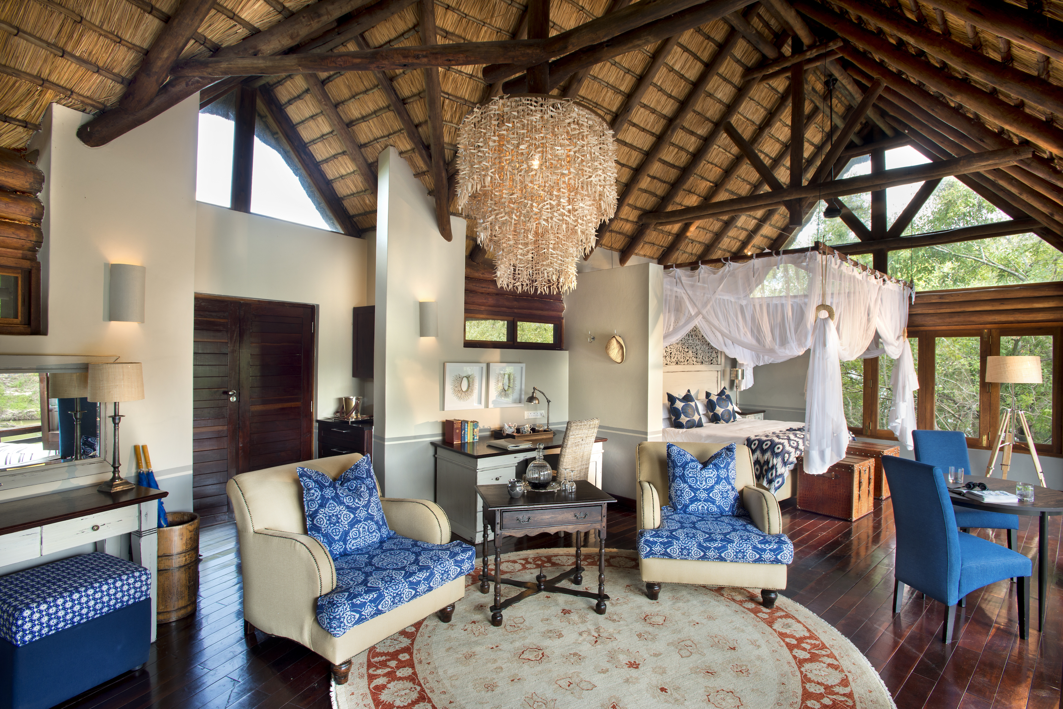 Considering that Island Lodge accommodates a maximum of eight guests, the main area is huge. A high thatched roof covers two lounges, divided by a common fireplace and splashed with colour. There's also an outdoor seating area on a wide wooden deck overlooking the river. The infinity pool, on the edge of the deck, gives the impression that you're bathing in the river. Dining happens almost anywhere you like, but mostly under the stars or beneath the ancient jackalberry trees.