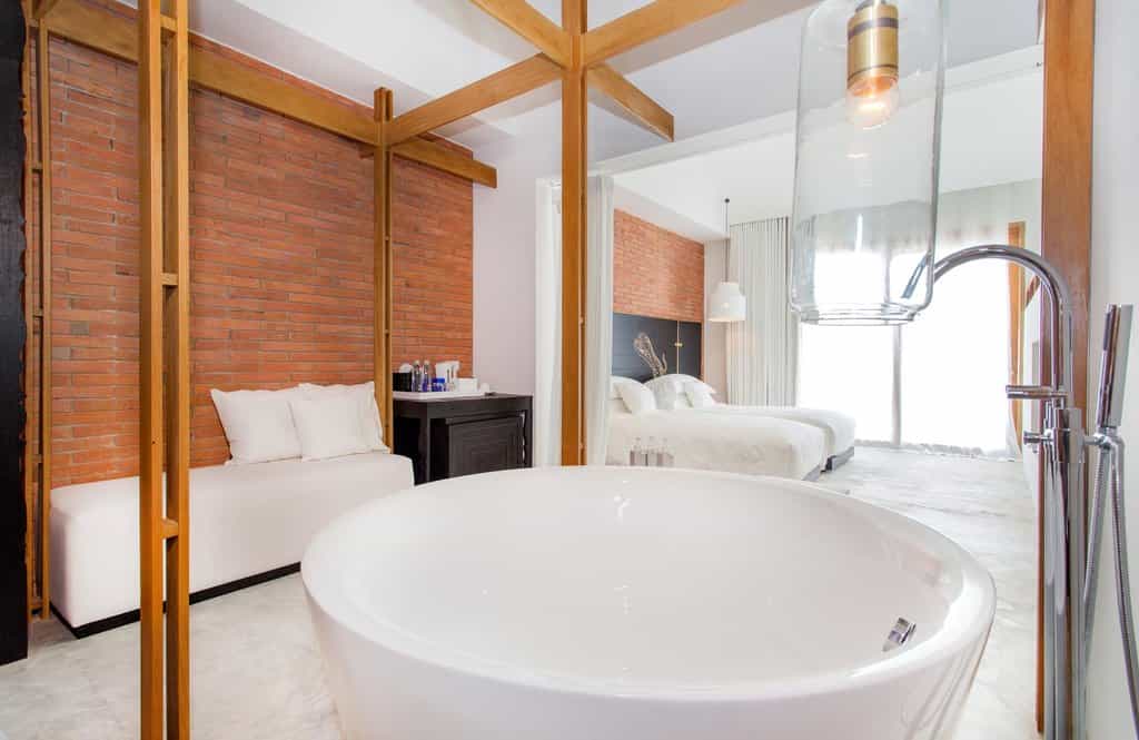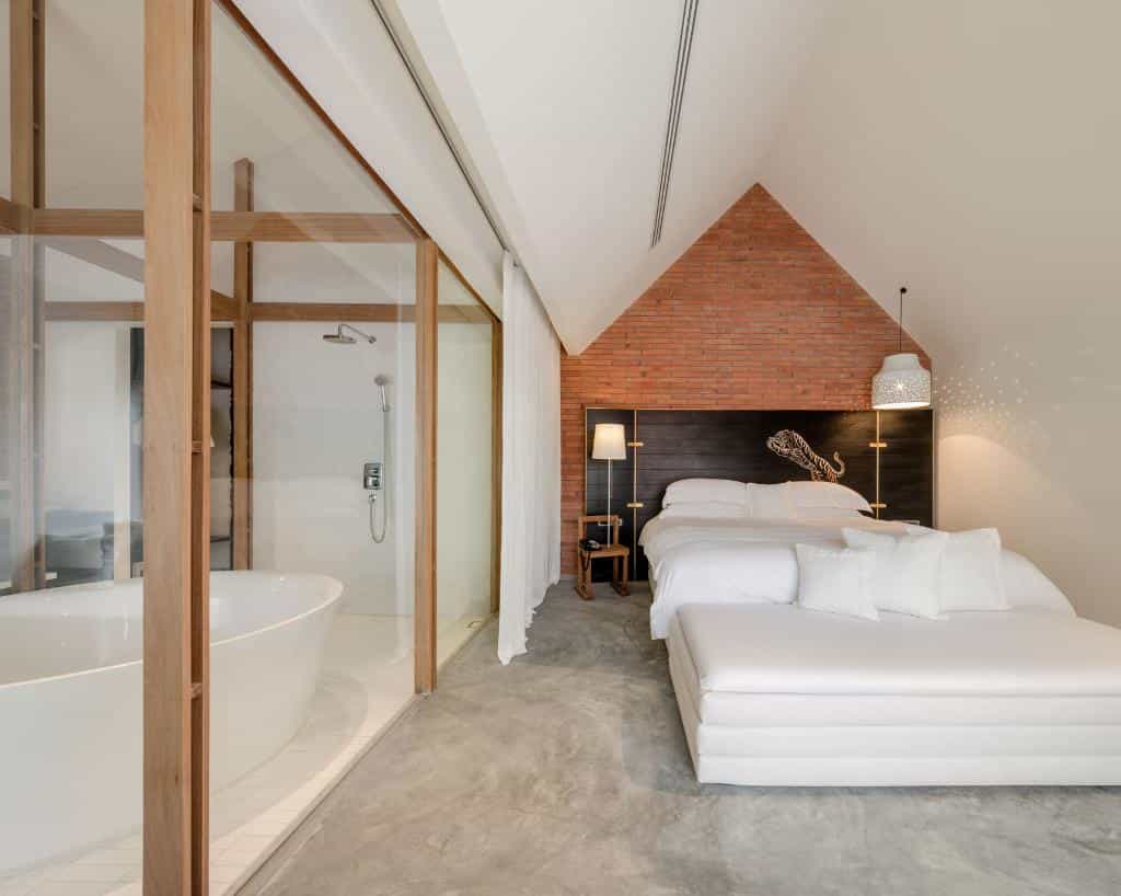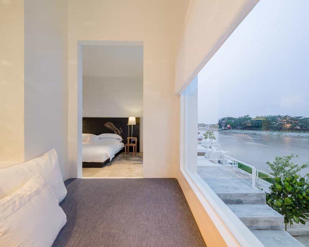 Each room has its own layout but you'll find the style quite similar with high ceilings, wooden detailing and sparkling white decor. The view is a unique factor, with a choice of the river, temples or tree-lined waterfront. The bathrooms have an edgy feel with glass-walled bathtubs and the king-sized beds have ornate black headboards embossed with gold tigers. There is one duplex suite with two bedrooms and a spacious deck, while the pool suite takes the top prize with a secluded plunge pool and oodles of privacy.