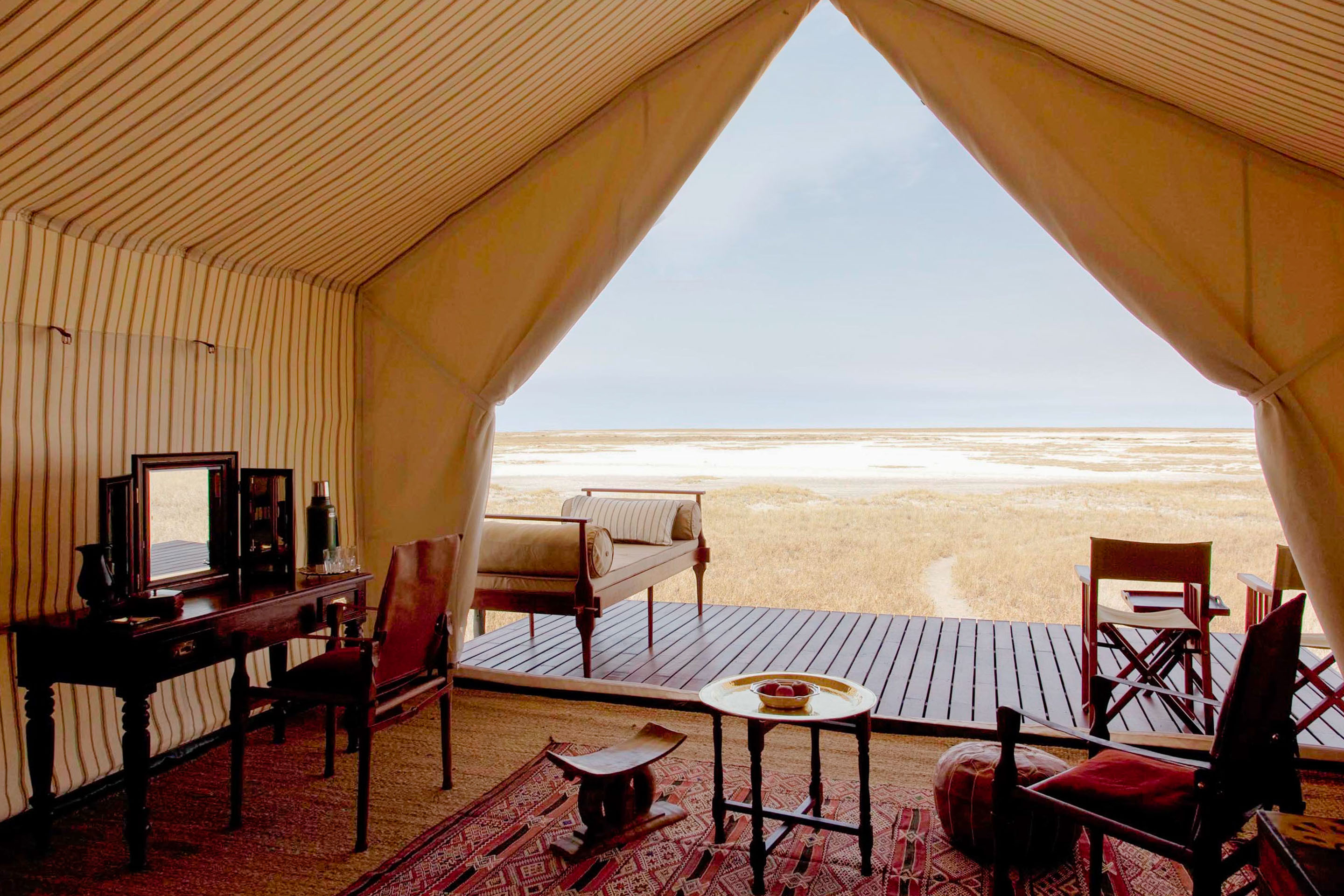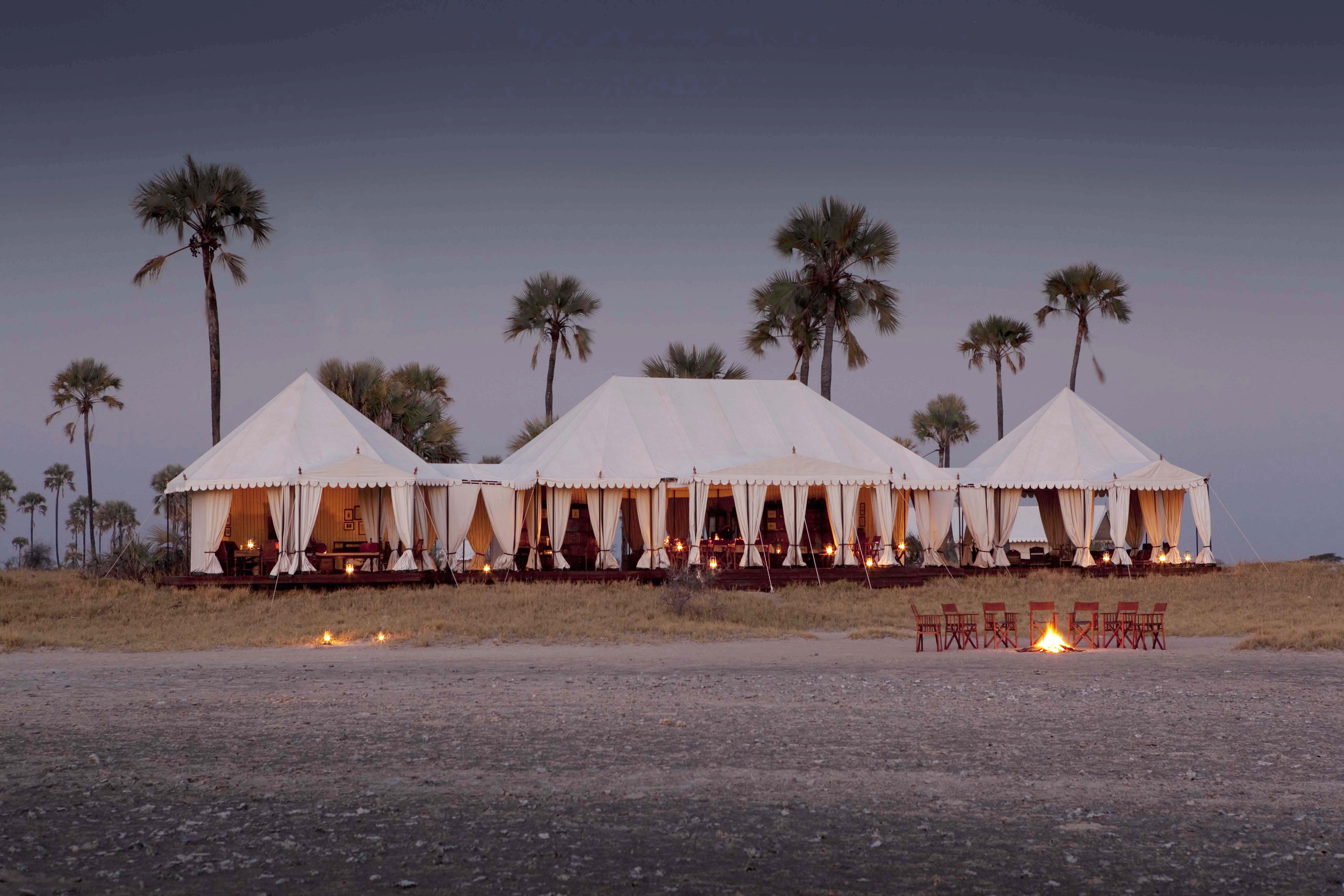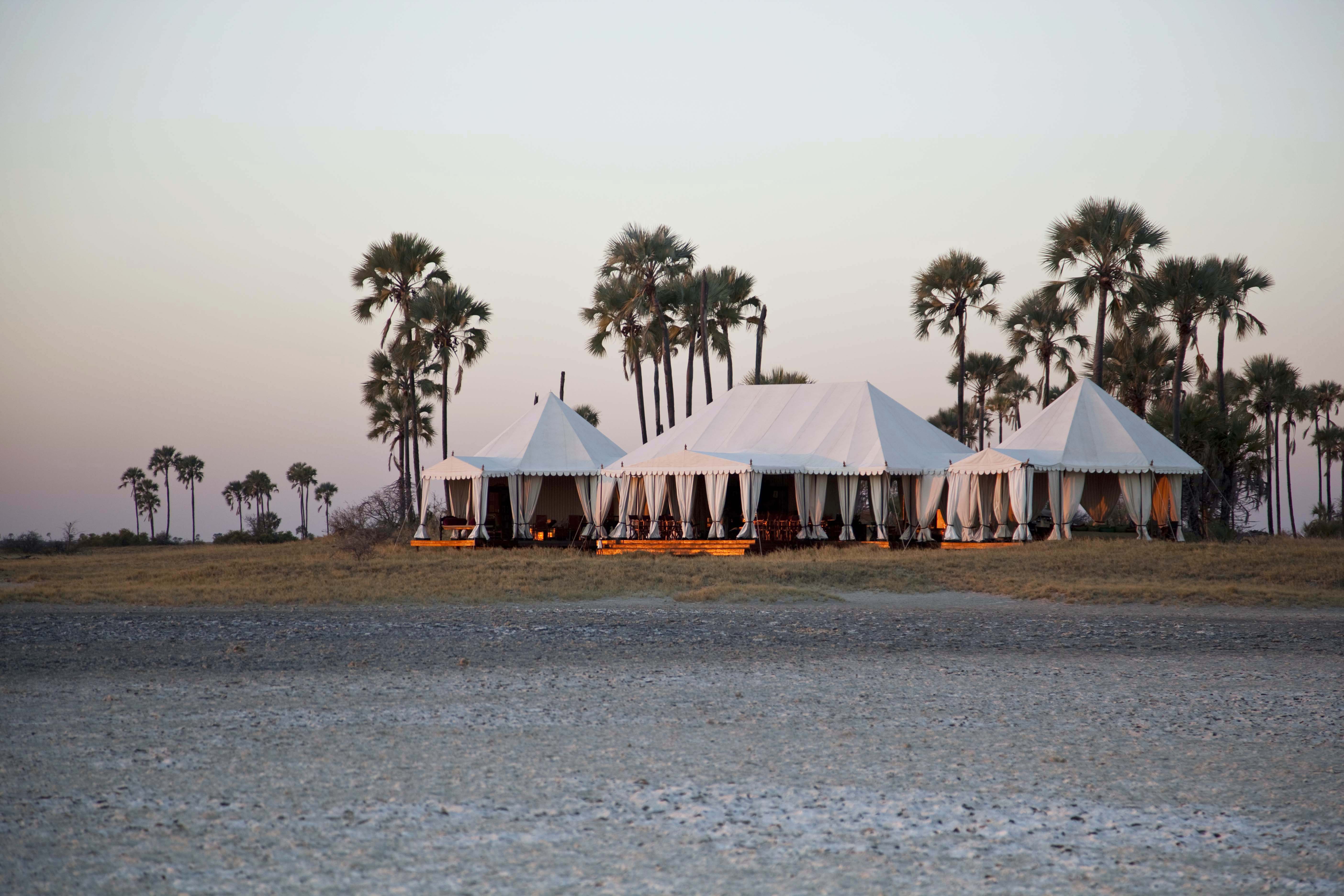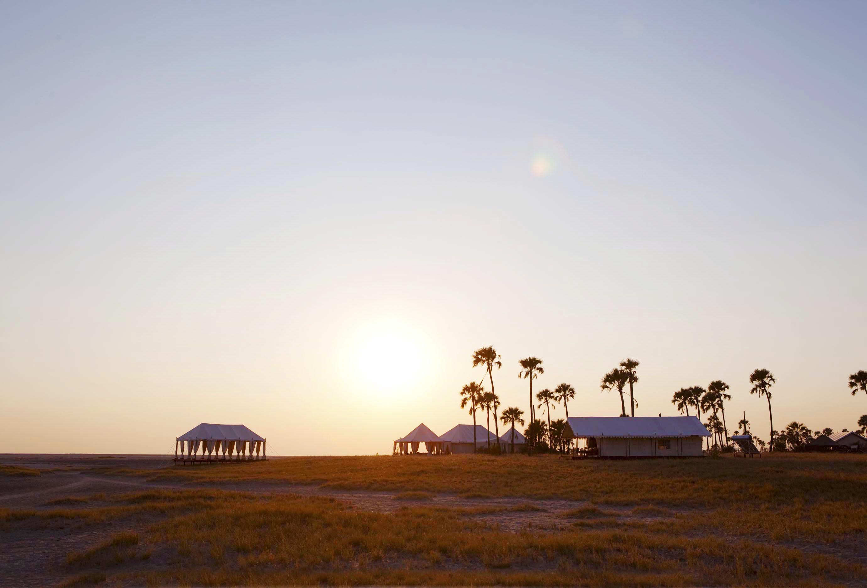 Everything here is exquisitely composed, like a film set. The luxury is only amplified by the lack - there is no electricity at San Camp, so paraffin lanterns scatter the camp and light the walks adding enchantment to the evenings. A mess tent with a large dining table is host to gourmet meals. You'll find a library tent full of bones and fascinating artefacts and carefully curated books. Take tea in the dedicated tea tent - a sprawling area with exotic rugs and cushions. Truly unwind in the tented yoga pavilion, meditating on the endless horizon.