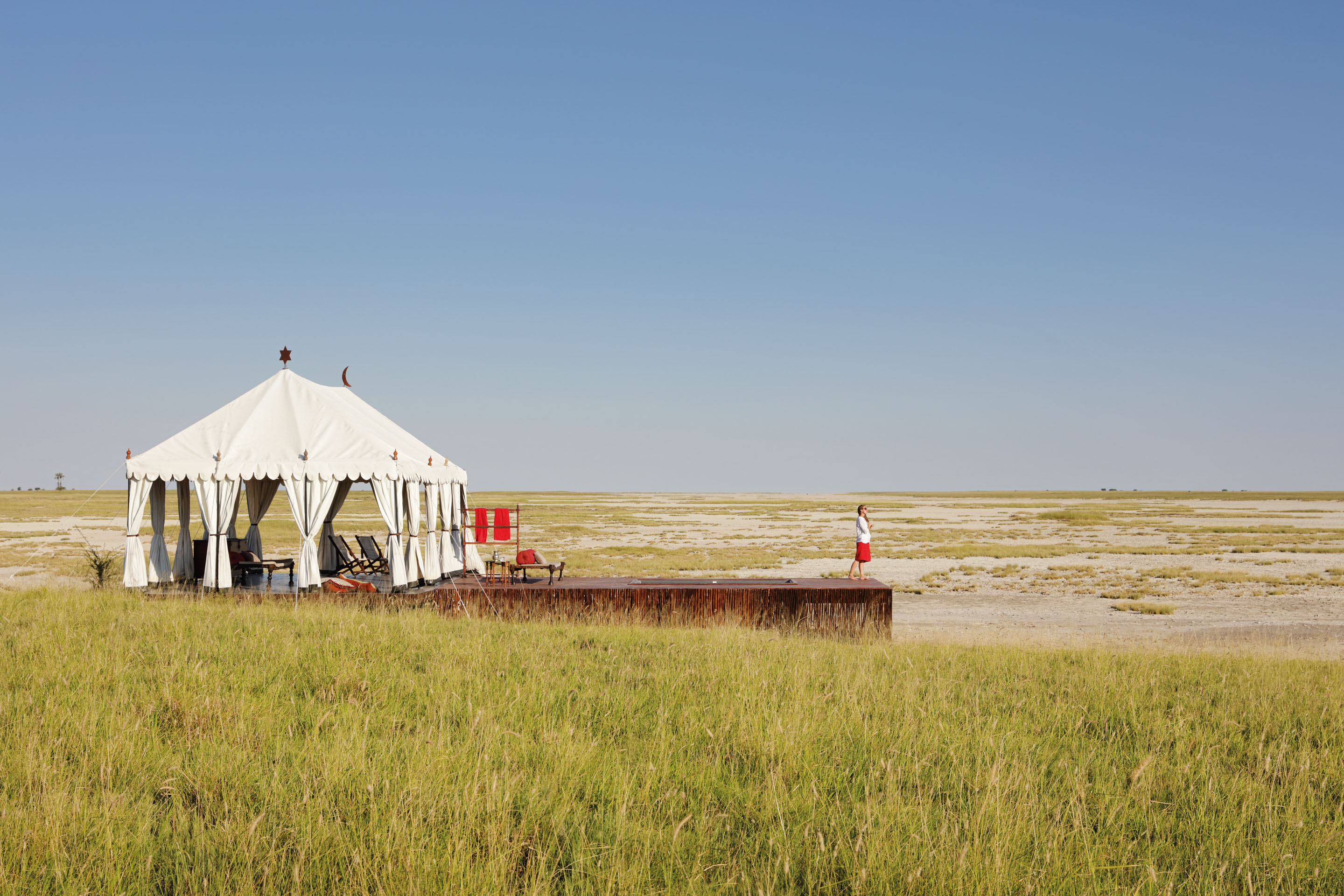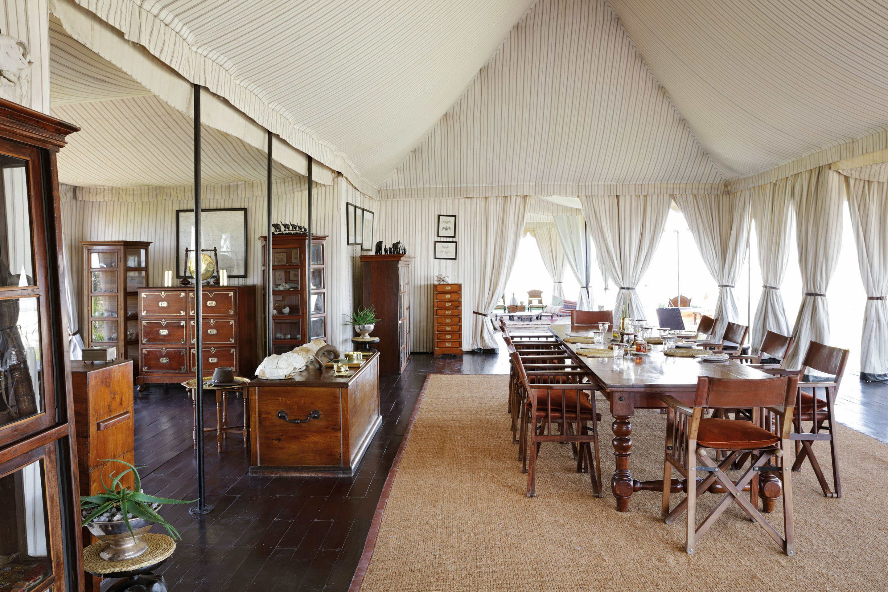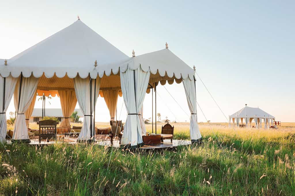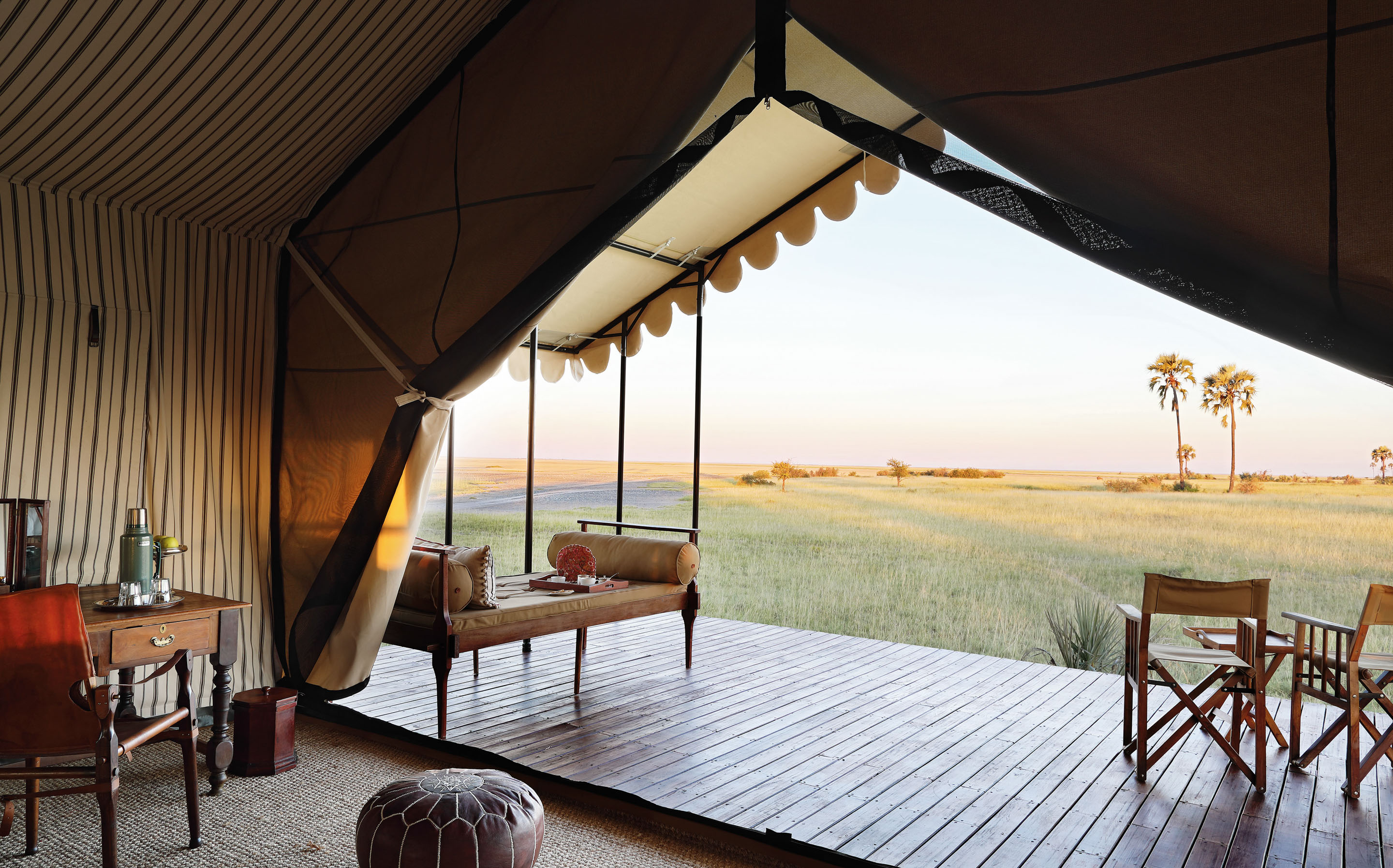Everything here is exquisitely composed, like a film set. The luxury is only amplified by the lack - there is no electricity at San Camp, so paraffin lanterns scatter the camp and light the walks adding enchantment to the evenings. A mess tent with a large dining table is host to gourmet meals. You'll find a library tent full of bones and fascinating artefacts and carefully curated books. Take tea in the dedicated tea tent - a sprawling area with exotic rugs and cushions. Truly unwind in the tented yoga pavilion, meditating on the endless horizon.