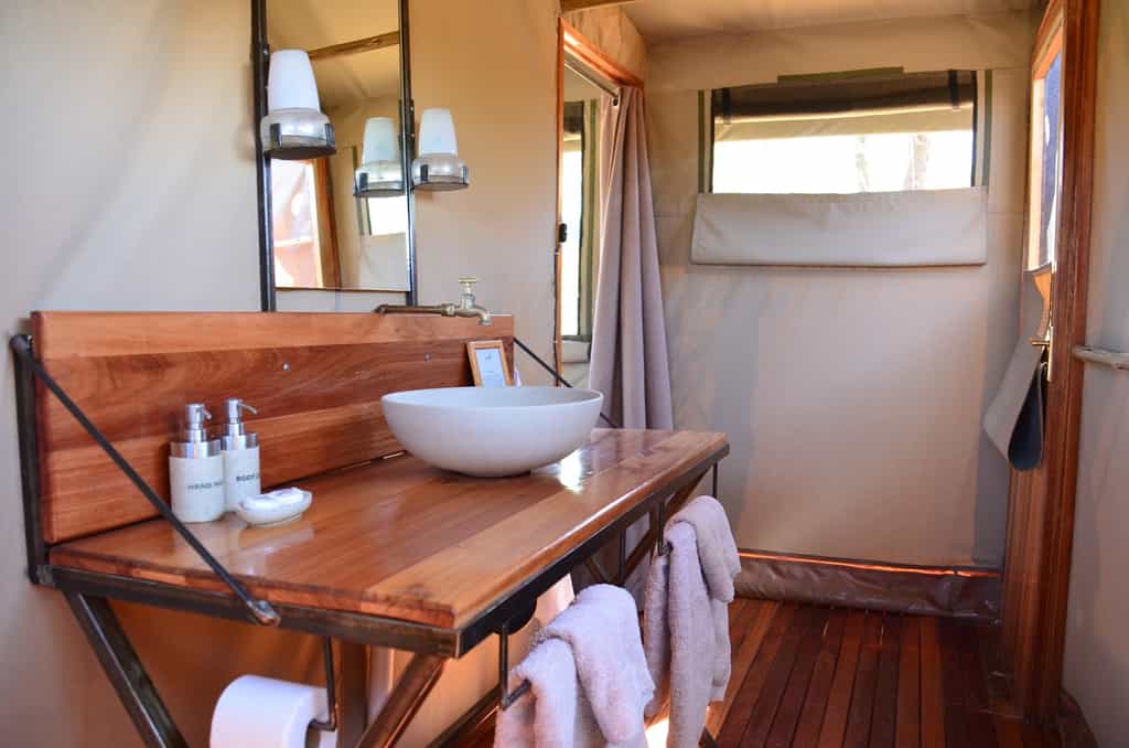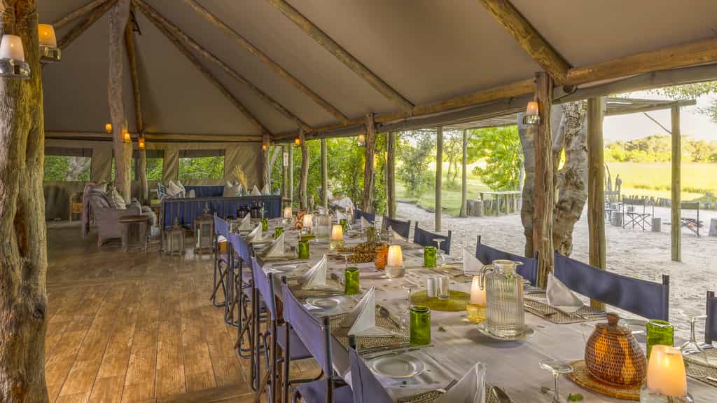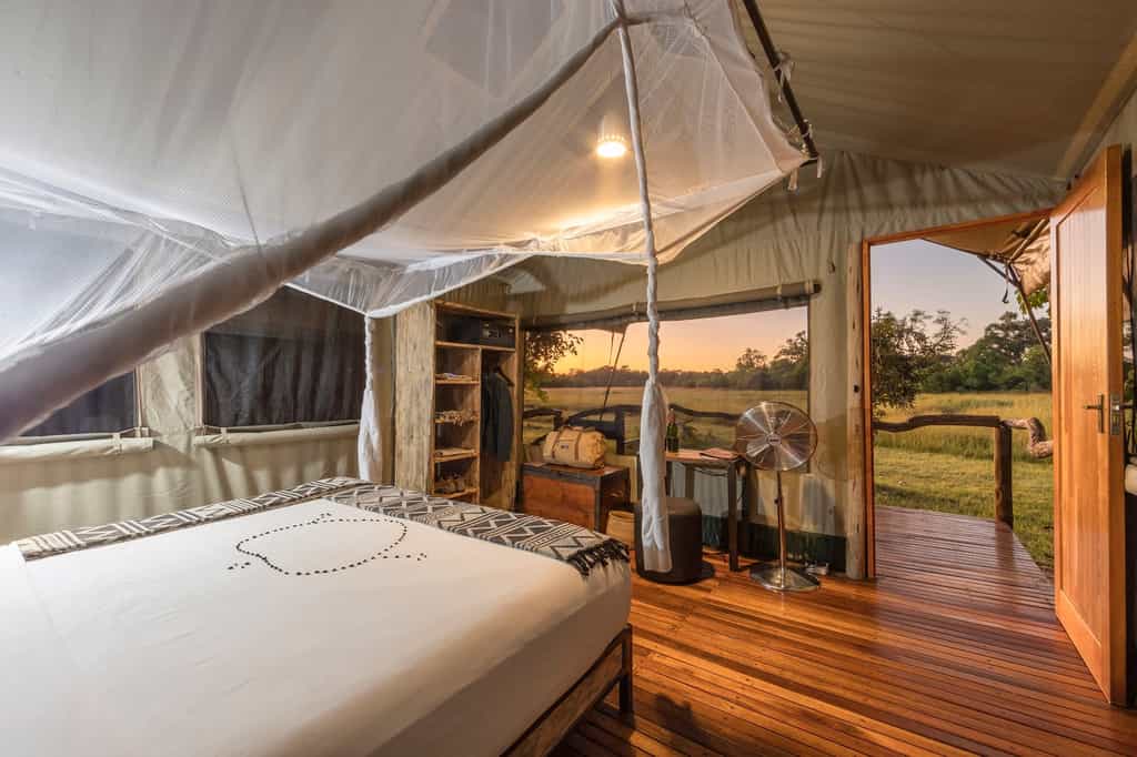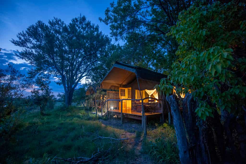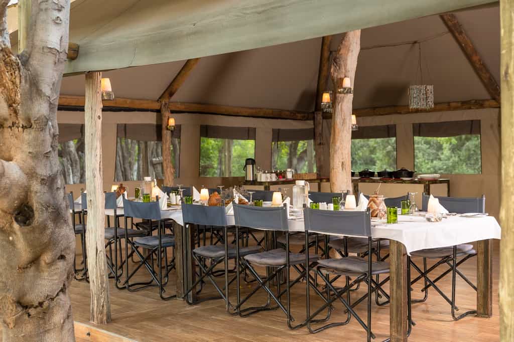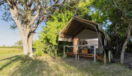 Six Meru-style tents stand clustered together just a short walk on ground-level pathways from the main area. The tents are a little too close to feel as if you've got the wilderness all to yourself but, hosting a maximum of twelve guests, it is a far cry from crowded. They are nevertheless perfectly adequate with lovely porches and floodplain views. Inside they are spacious, with ensuite bathrooms, two single beds (draped with mosquito netting at night, tucked away during the day) and solar-powered lighting. Enjoy a heated bucket shower alfresco - a basic but real-safari style luxury!