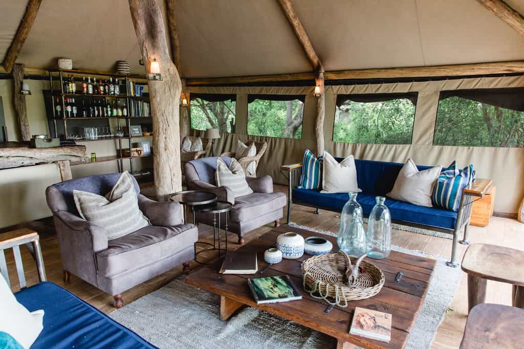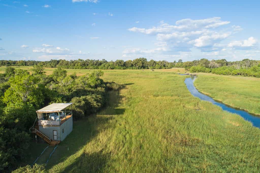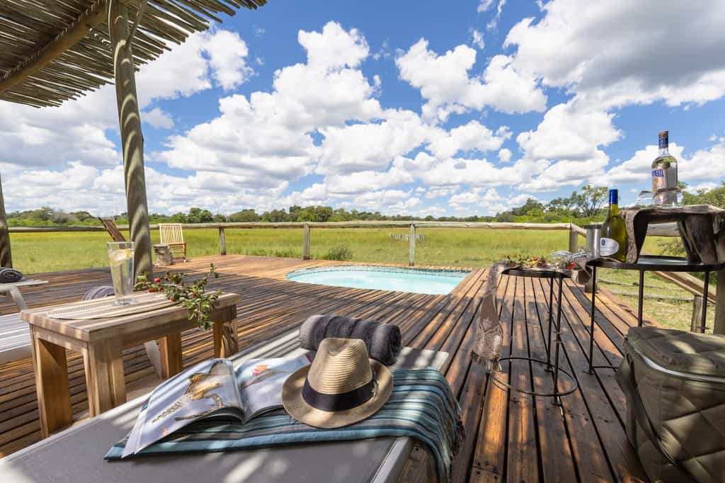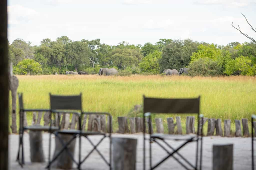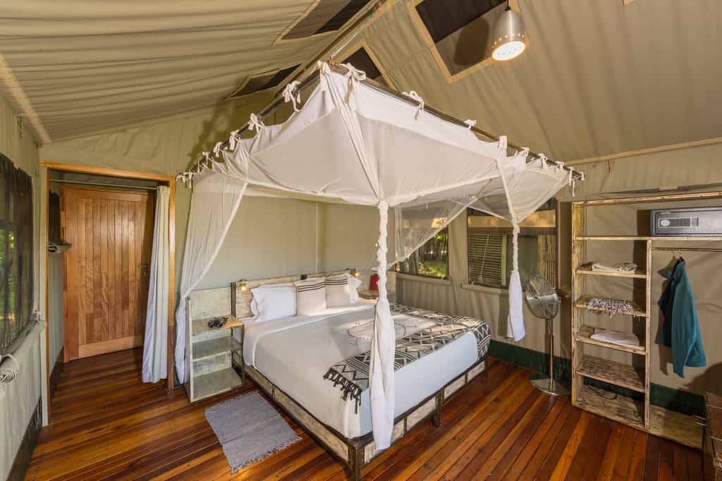 Six Meru-style tents stand clustered together just a short walk on ground-level pathways from the main area. The tents are a little too close to feel as if you've got the wilderness all to yourself but, hosting a maximum of twelve guests, it is a far cry from crowded. They are nevertheless perfectly adequate with lovely porches and floodplain views. Inside they are spacious, with ensuite bathrooms, two single beds (draped with mosquito netting at night, tucked away during the day) and solar-powered lighting. Enjoy a heated bucket shower alfresco - a basic but real-safari style luxury!