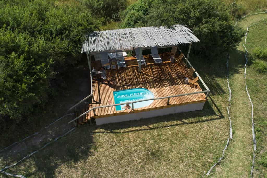 This simple structure offers a pleasant, airy setting from which to enjoy views of the floodplain and river beyond. Colourful cushions and chairs liven up the lounge area, with a few authentic artefacts to pique your interest. There is a small book collection and a very small bar. The single, long, communal table doesn't look like much but during meal times animates with conversation from guests' adventures and serves up simple, wholesome meals. The open sandy patch harbours the campfire whose cozy tug flanks a day in the bush - in the morning, enjoy a cuppa and a slice of fire-roasted toast before you set out for the day, in the evening, sip a gin and tonic and recount the day's adventures as you watch it crackle beneath a vault of stars. A small plunge pool adjacent to the main area offers some reprieve from the heat, though not much shade.