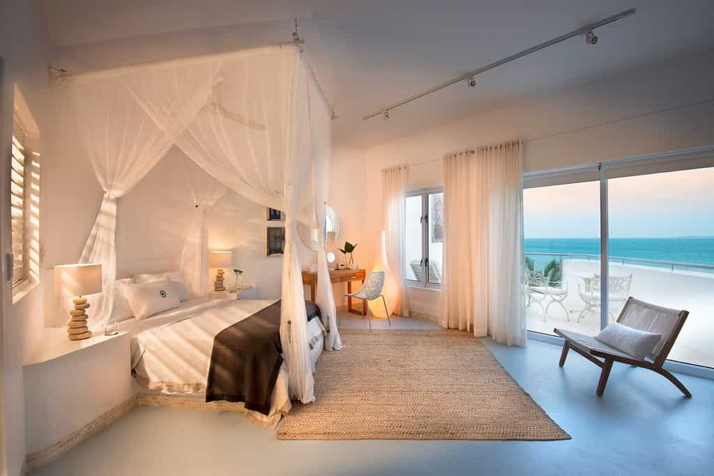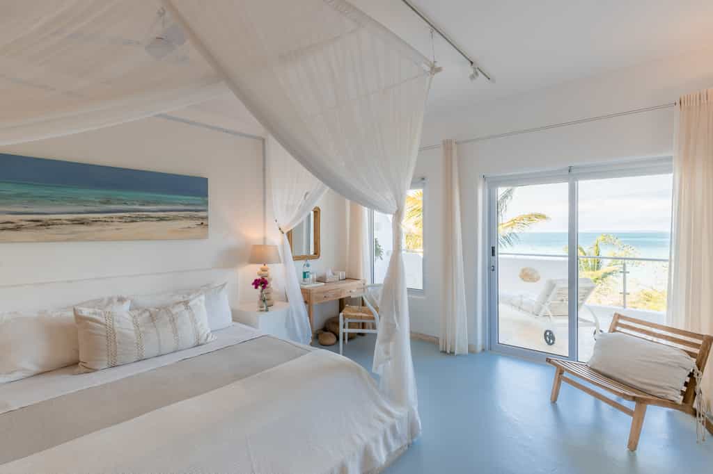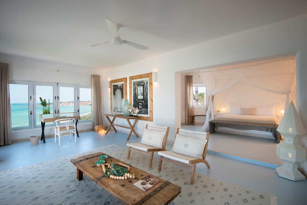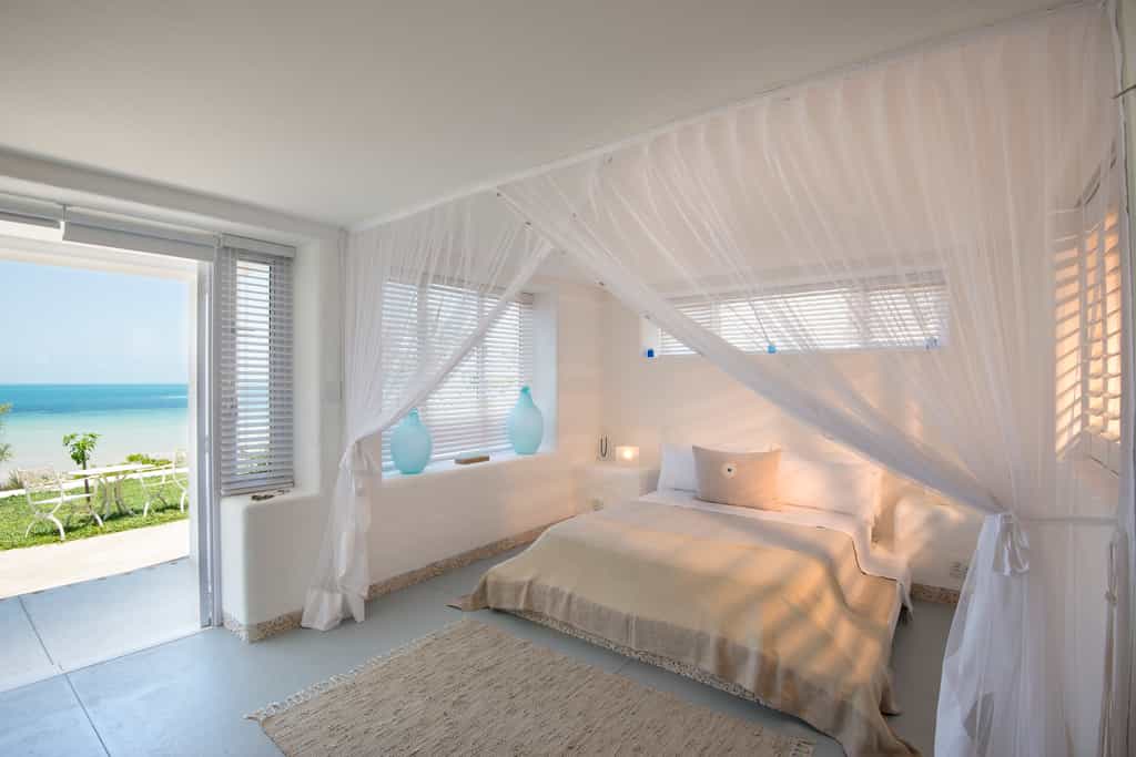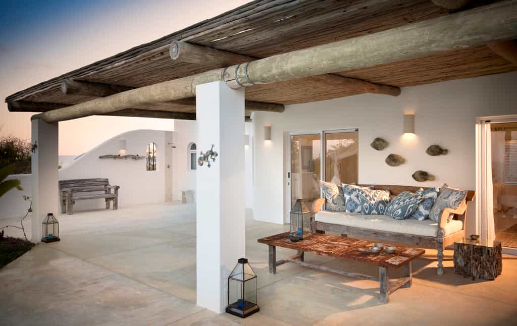 The crisp white walls and elements of scattered ocean blue decoration echo's a slice of a Greek village brought to the Mozambican shores. Light and natural the villa is all about creating spaces for you to kick back and take in the surrounds in solitude. The main villa is spread around an inviting pool, central dining and outdoor barbecue area. There are plenty of scattered patio areas; on the roof or nearer the ocean, if you are seeking a specific retreat. Take in the lapping ocean views from the rooftop Sala Bar while enjoying Santorini's creative and tasty cocktails.