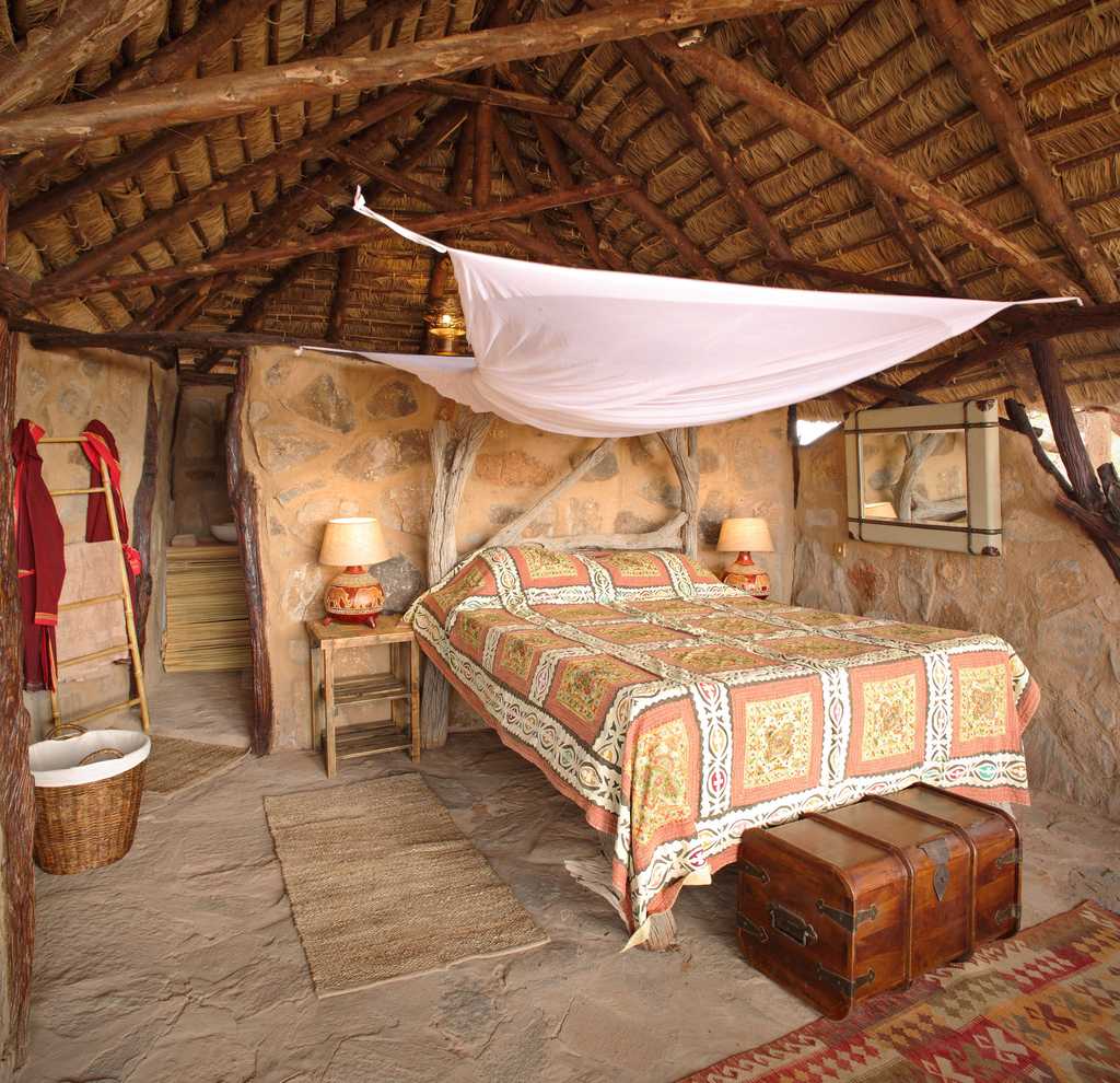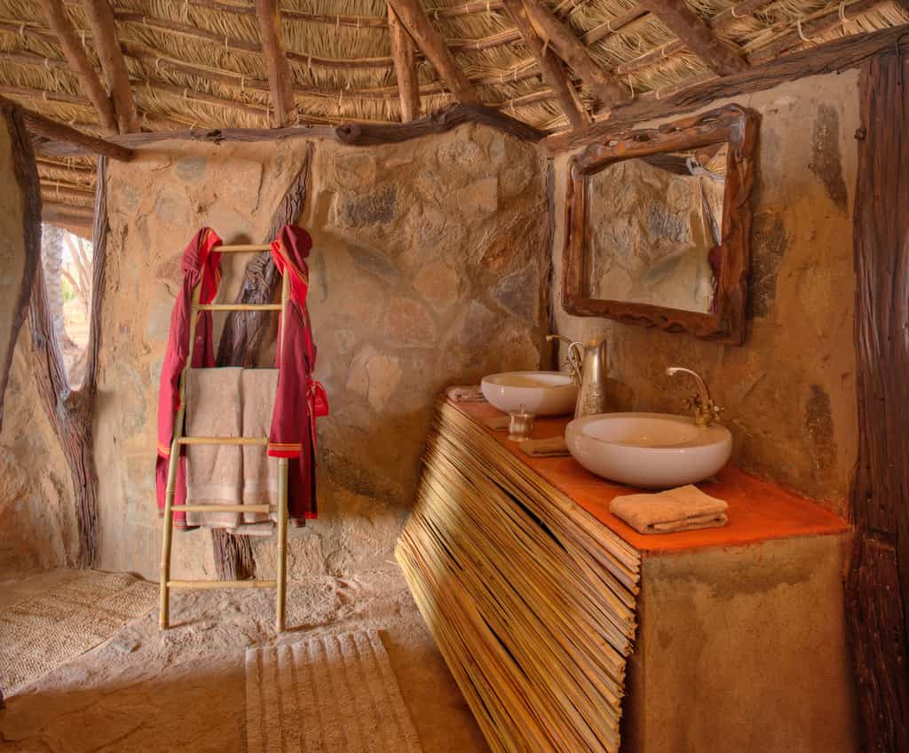 The communal area is housed in an open-fronted thatch and stone building. A wooden dining room table and rust-coloured lounge suite are the main features with kilims, a coffee table and travellers trunk finishing off the laid-back safari decor. Dining also happens out in the open, in front of the mess area, with the breakfast buffet served on beautiful reclaimed logs and there’s a view down the dry river bed complete with a waterhole, which enjoys daily visits from elephants and other wildlife.