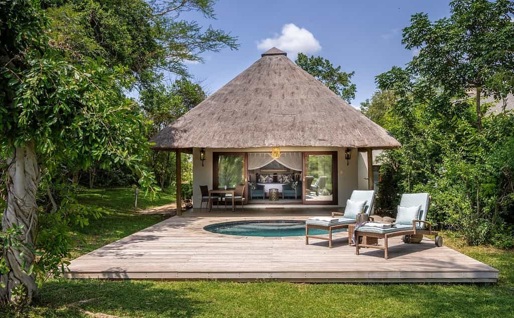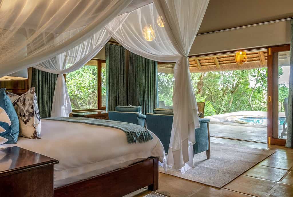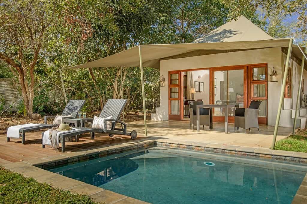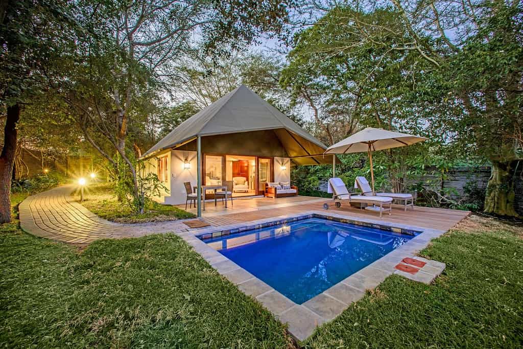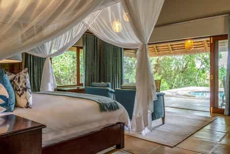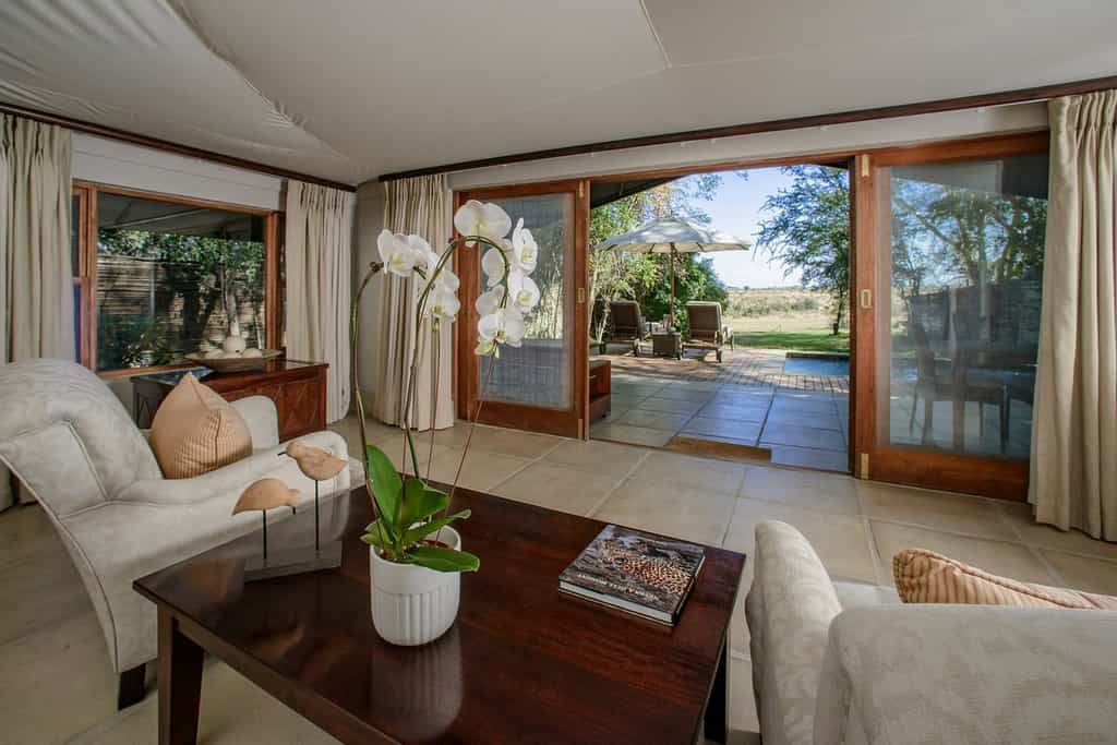 Four luxurious canvas suites tucked away under shady trees offer a tented experience with all the comforts you'd expect, like private decks overlooking the waterholes, en-suite bathrooms, and indoor and outdoor showers. A trio of executive suites, each with its own plunge pool, offers an even more lavish tented experience, while the exquisite two-bedroomed Savanna Suite with its own swimming pool and private game viewing vehicle makes this the ultimate exclusive option for a family or group of friends.