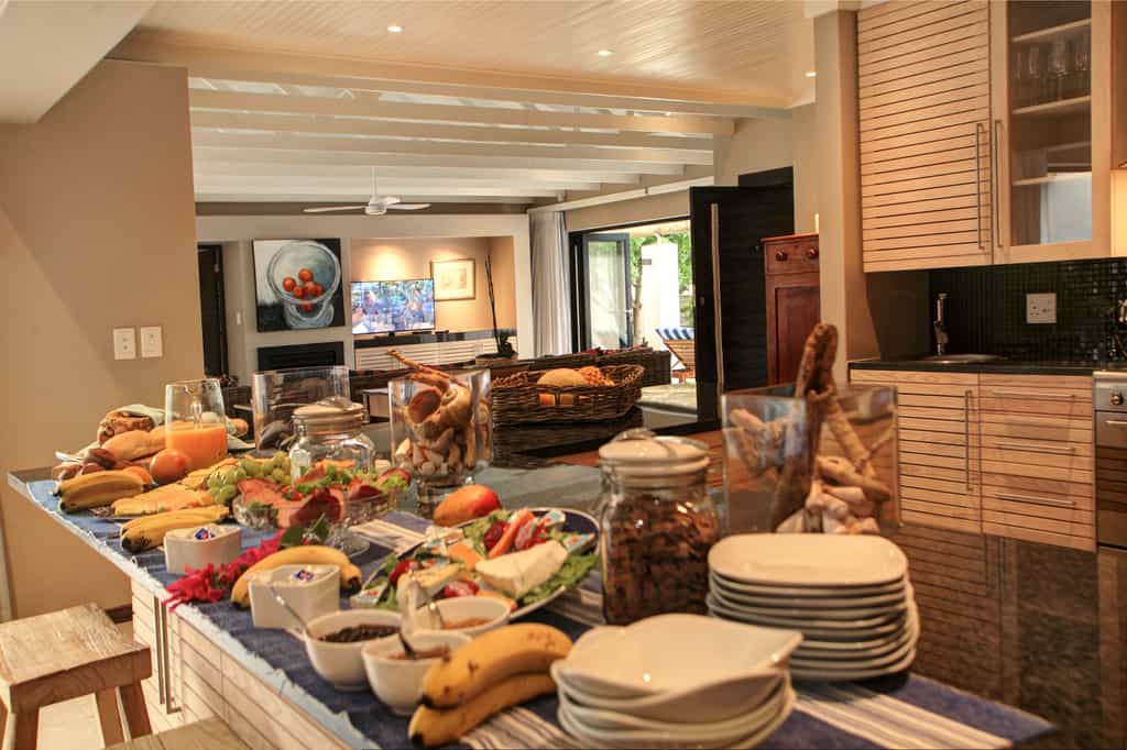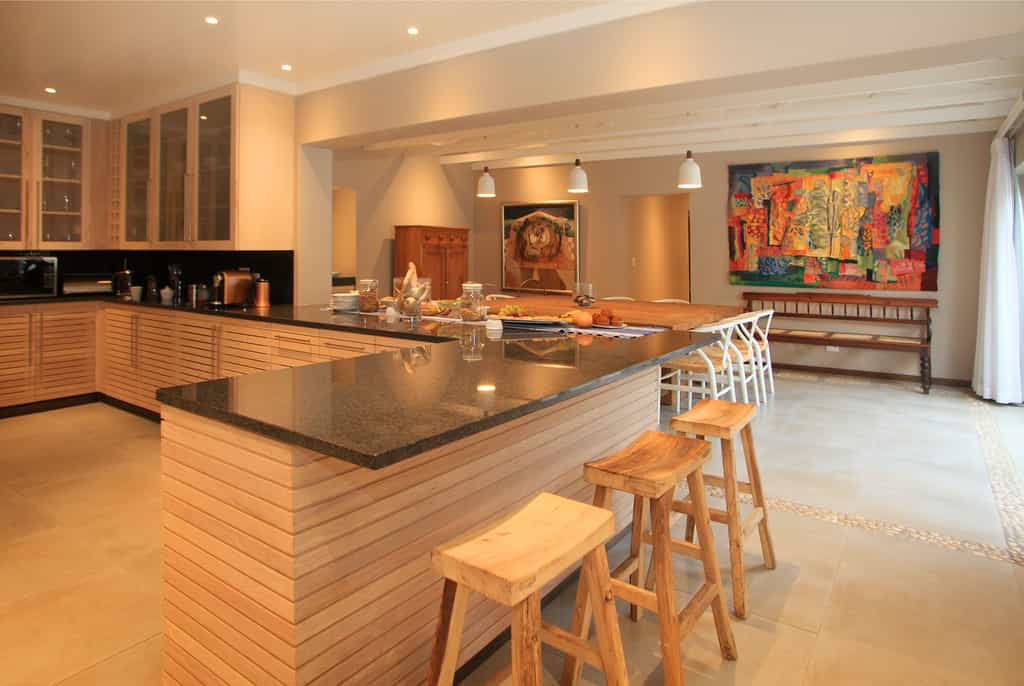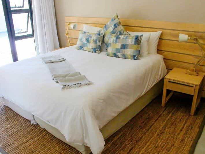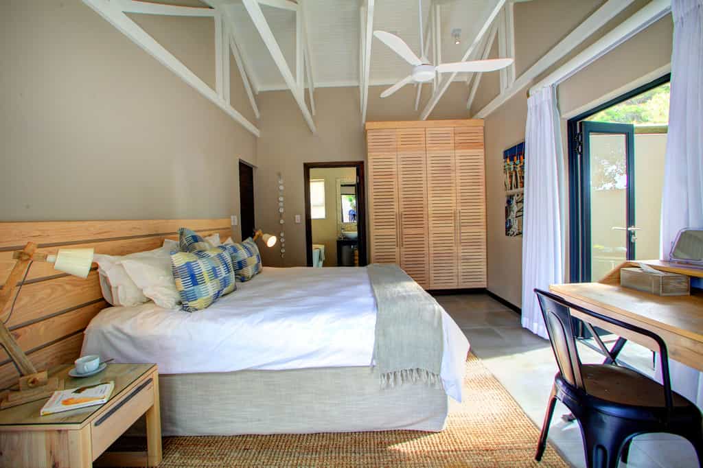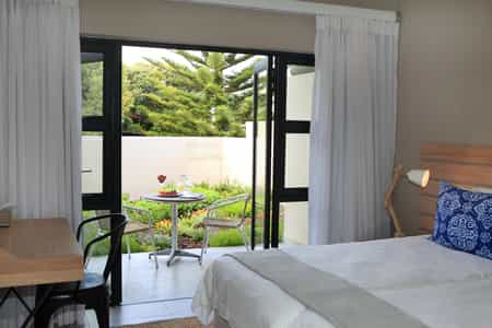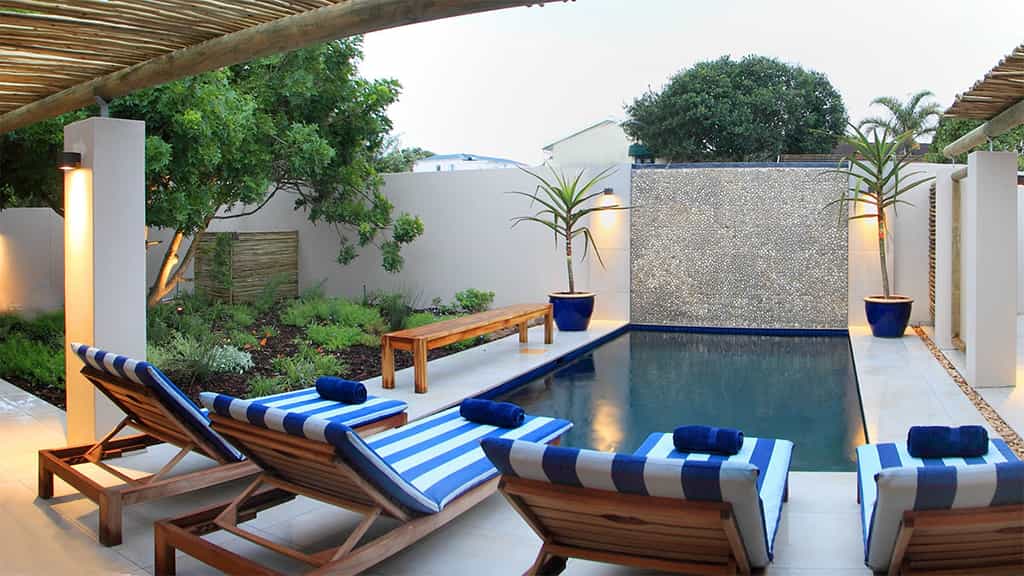 The main area has an airy, open-plan design, with high ceilings over white wooden trusses giving a sense of light and space to the lounge and dining room. Glass doors open completely to the shaded terrace and small pool. A surprise is the patio, with a second large dining table and two hanging chairs. The gardens are indigenous and the decor is comfortable and modern, with earthy colours and natural materials combined with vibrant ocean-inspired fabrics and artworks.