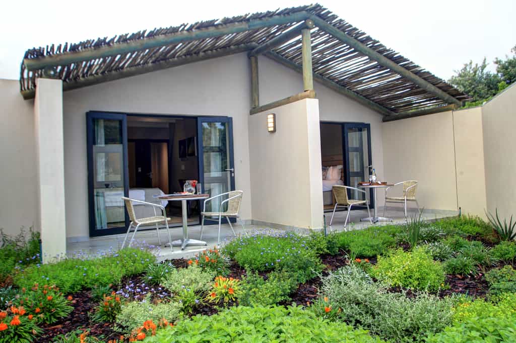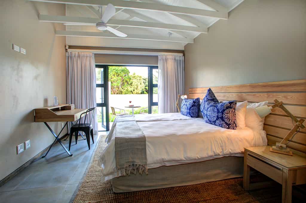 Five guest rooms with full en-suite bathrooms can be booked on a per-room basis or as a whole self-catering house. Each has its own unique style, and all feature subtle earthy tones with sleek modern finishes. The suites are equipped with underfloor heating, safes, wi-fi access, heated towel rails, beach towels and beach bags, luxurious linen and coffee and tea facilities. Three of the rooms have natural outside showers and others have private patios overlooking the gardens or swimming pool.