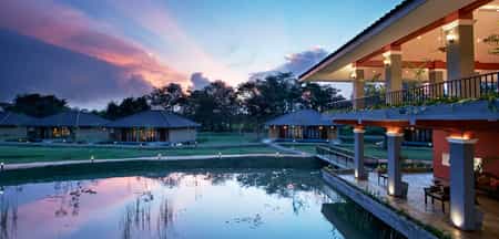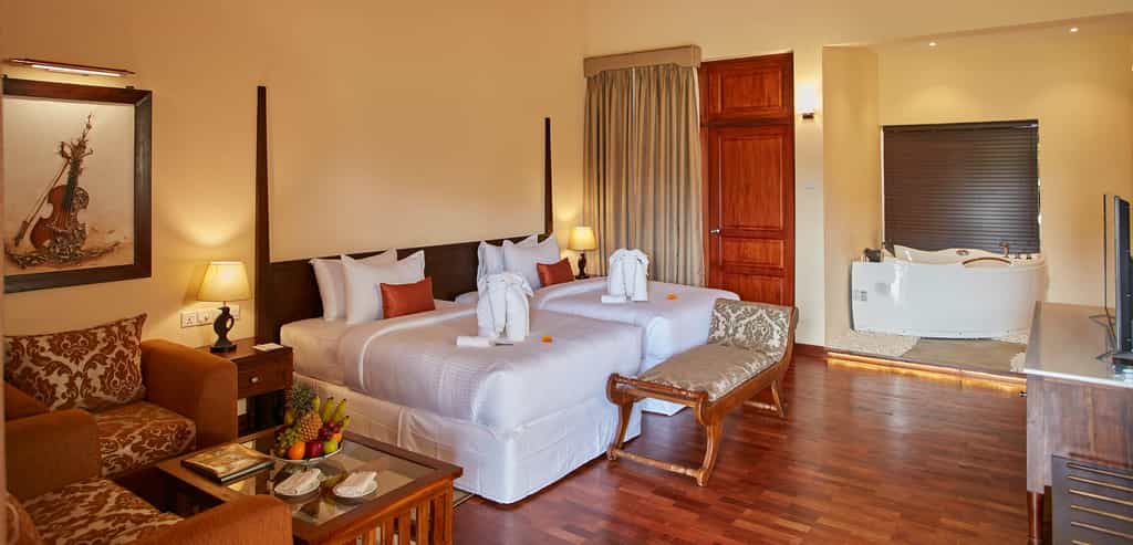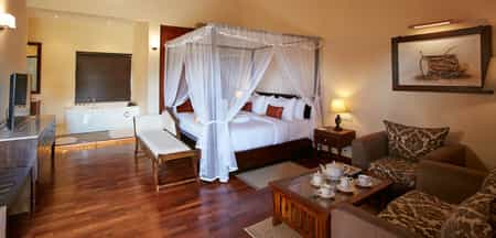The rooms are distributed in cottage buildings which are well spaced out in a semi-circle around the main pavilion. All rooms have a private veranda, an indoor sitting area, deluxe toiletries, bathrobes and slippers, flat screen TV with 50+ satellite channels and complementary tea/coffee facilities.