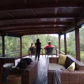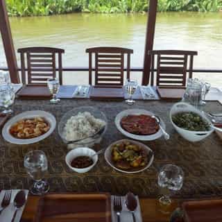 The open-air deck is the social heart of the boat, perfect for alfresco dining and wildlife spotting. Meals are a gourmet affair, featuring organic, locally sourced ingredients whipped up by the onboard chef. By night, relax under the stars with a chilled drink in hand, listening to the sounds of the jungle.