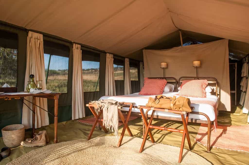 There are just six subtly elegant tents in a beautiful setting with great views. Each is spacious, with hand-crafted furniture, good linens and a comfortable bed. The bathroom is en suite, with a tub, handbasins, a toilet and a shower with an open roof, allowing you to soap yourself beneath the stars. Each has a sheltered porch area with chairs overlooking the bush.