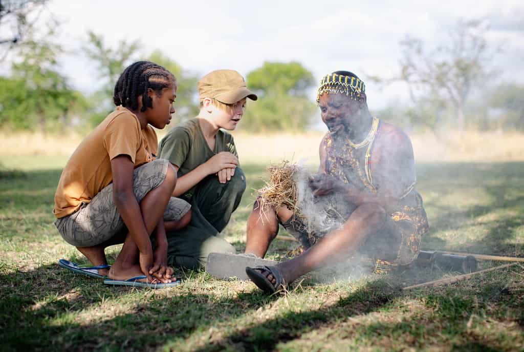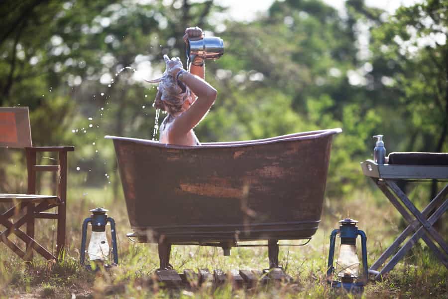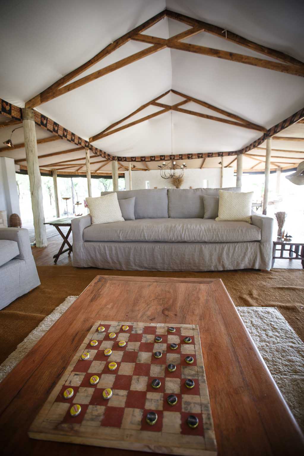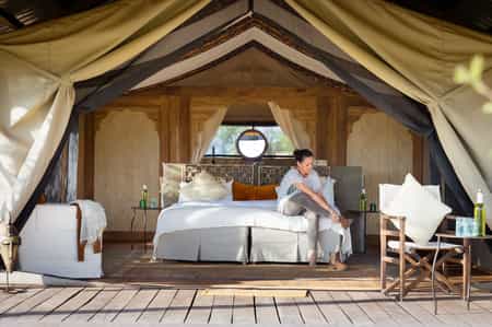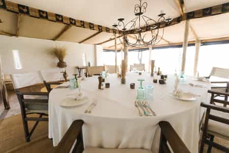 A Meru-style tent in the centre of camp is home to the dining area, lounge and bar. Velvet chairs beckon you to take a seat and gaze at the views of the river and bush beyond, and there's also a small library if you can tear your eyes away from the action. Meals are served family-style at the large dining table - an excellent time to meet fellow travellers and share your stories - and the all-important fire pit is just to the side, when you're ready to retire with a night cap.