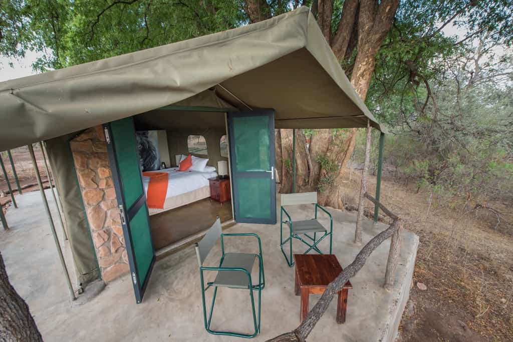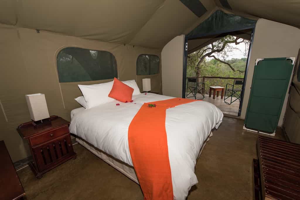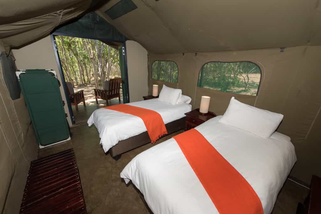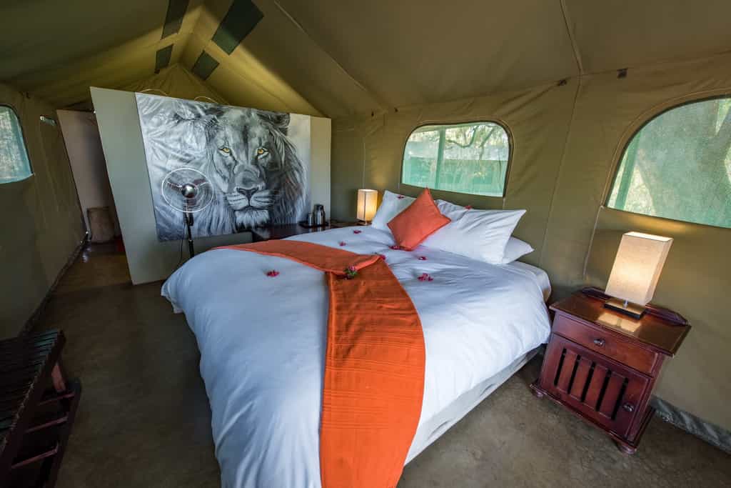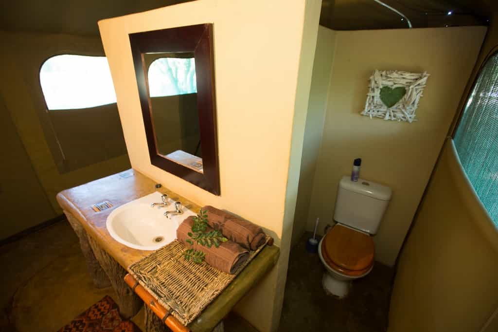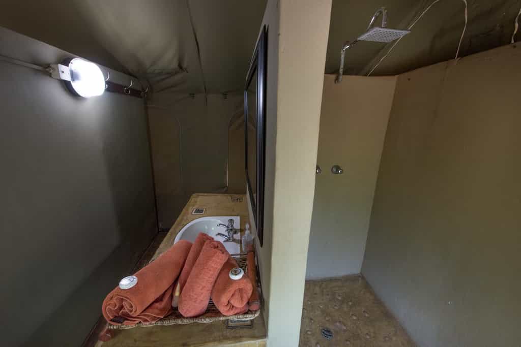 The tents are comprised of twin rooms and double rooms, each tent has an electricity supply to them, fans and both electric and hurricane lamps. There are en suite showers with hot water and flush toilets, bed linen, towels and amenities are provided. There is also an additional self-contained self-catering unit. This unit comprises one large bedroom with a double bed, a sofa and plenty of space for stretcher beds should extra beds be required in the unit.