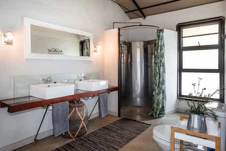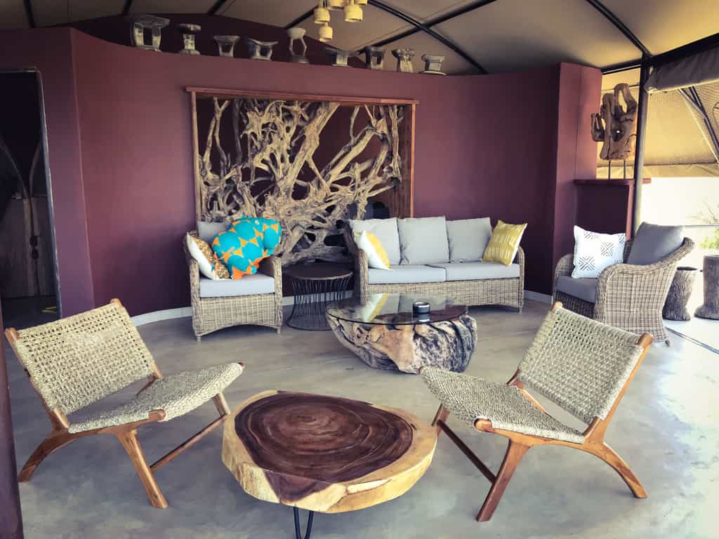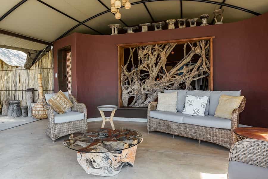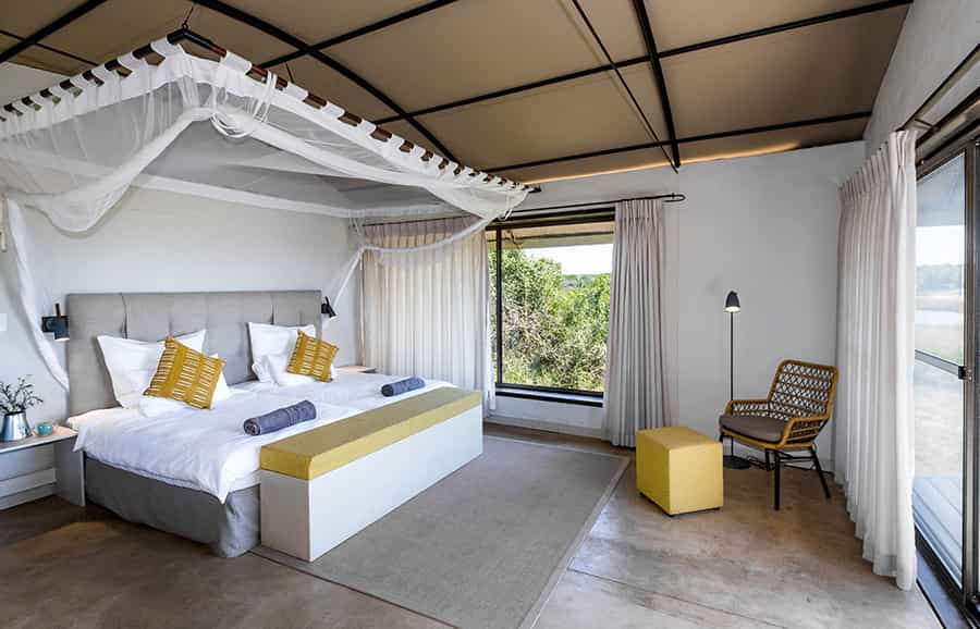 The central guest area sits on a raised deck and consists of two comfortable lounges, a spacious dining room and a chic bar, all with fabulous river views. The quirky design incorporates sandbag walls and natural timber in organic, flowing shapes created to catch the cool breezes off the water – they also do a marvellous job of keeping the fierce summer heat at bay. In front of the lodge is a swimming pool and sundeck surrounded by lush lawns.