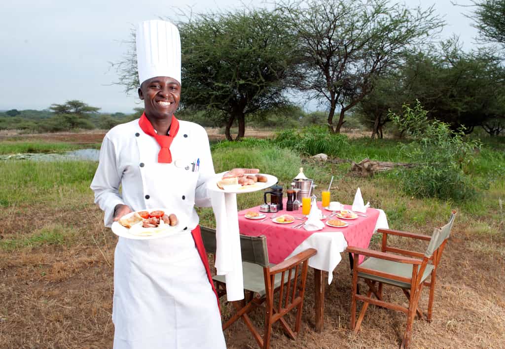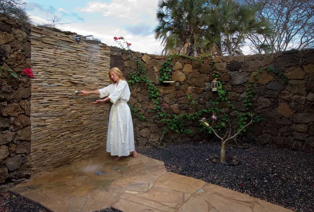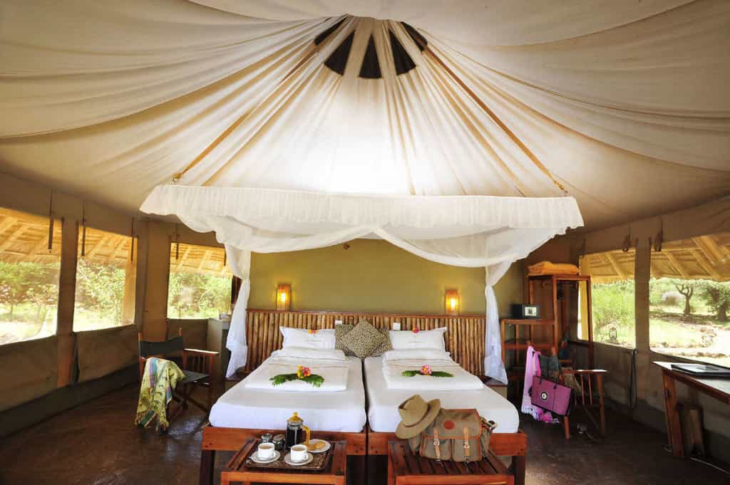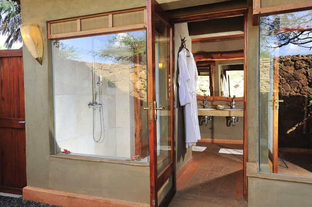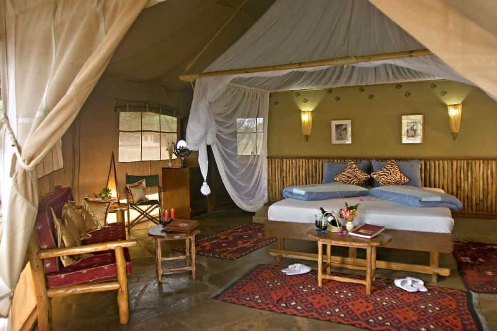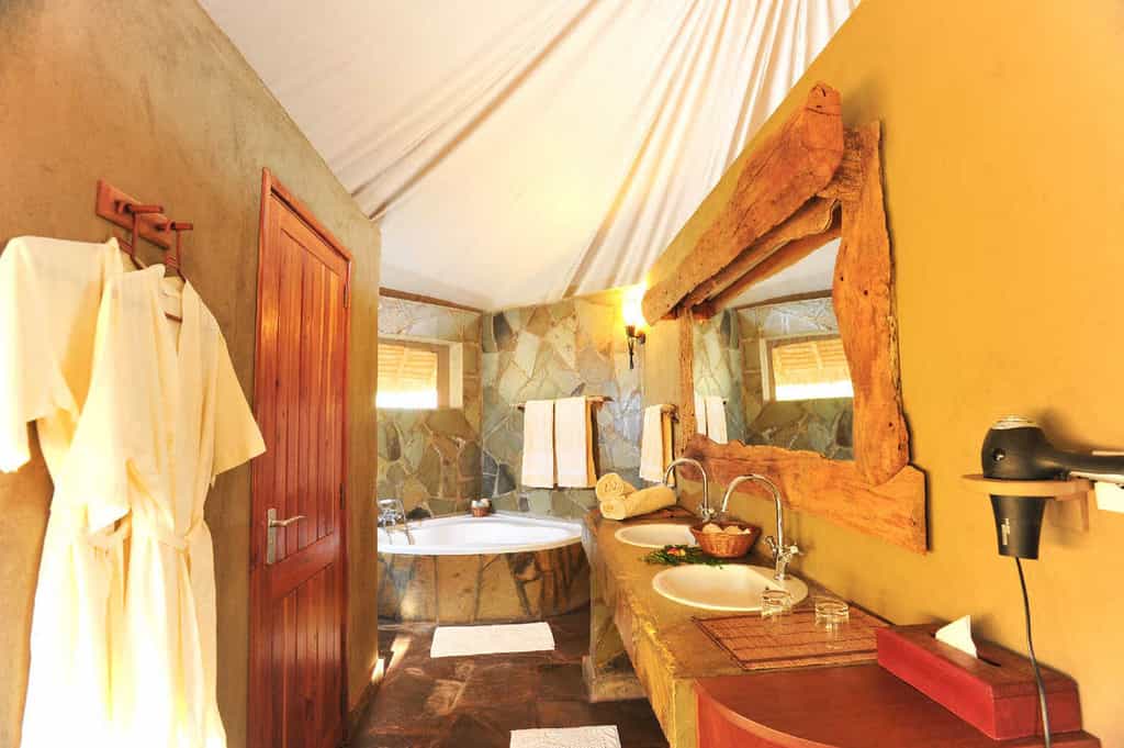 There are twenty-seven rooms in total, spread out relatively closely in an arc and looking out towards several small waterholes and the bush beyond. They include twenty-one octagonal tents, simply furnished and most with twin beds, and two junior "Mawenzi" suites, and four cottage suites. Suites are almost double the size of the tents (with an extra lounge area), and their bathrooms come with bathtubs or outdoor showers. The suites are also further from the main area and afford more privacy.
