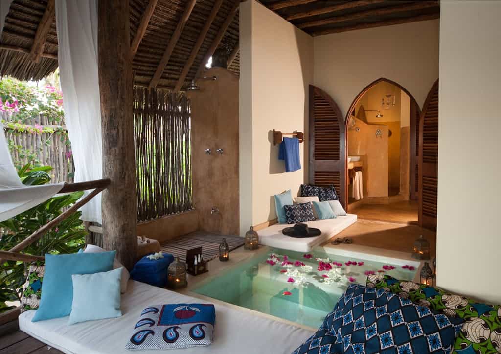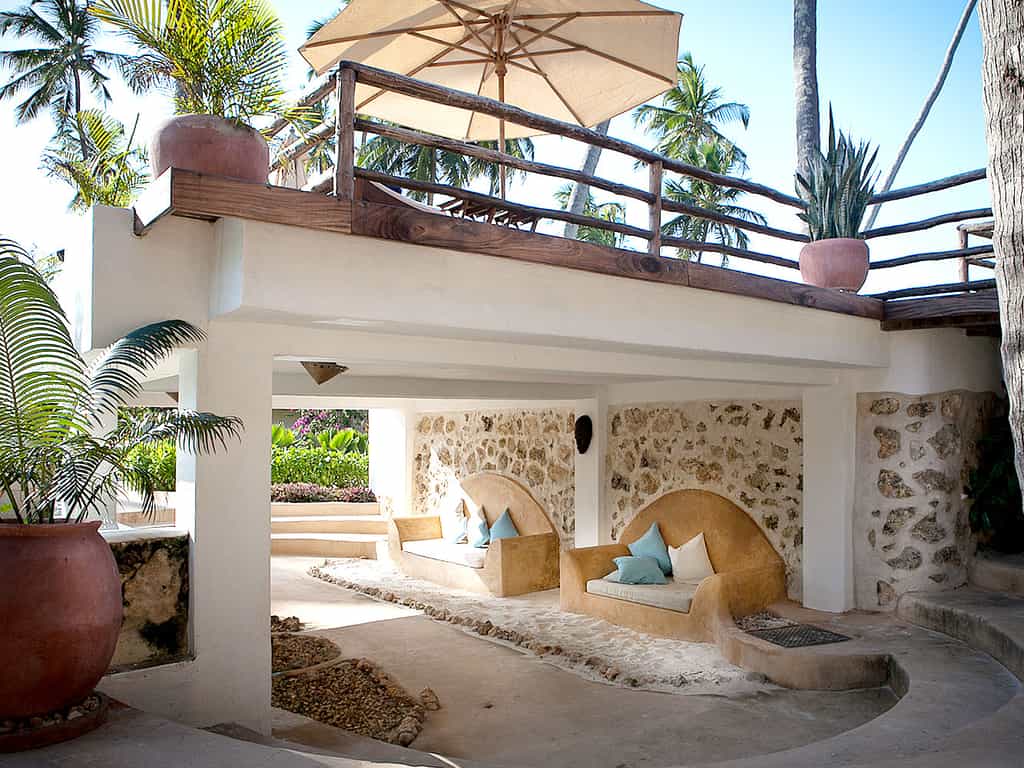Compact and intimate in layout, Sevi Hotel offers a very relaxed and authentic feel. Island-style Makuti roofs and traditional Zanzibarian brickwork disappear into dense gardens, creating a feeling of seclusion and privacy. A large wooden-decked restaurant is strategically perched to maximize the beach view, with distant island atolls beyond. Water is a key ingredient, with the expansive ocean nearby, as well as two pools, one overlooking the sea and one the gardens.