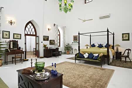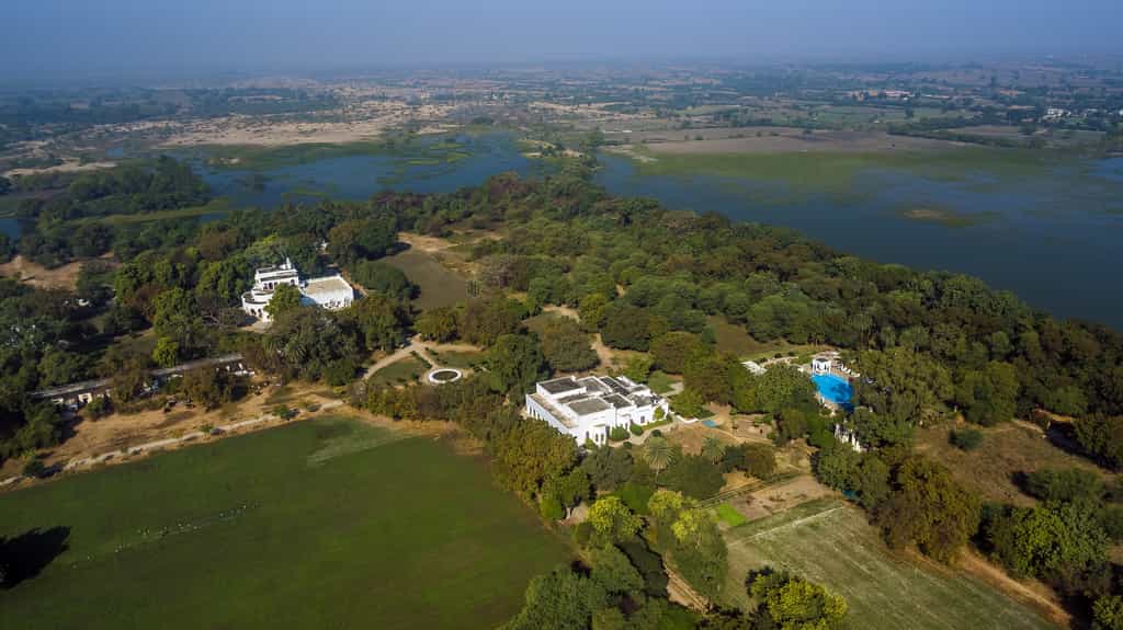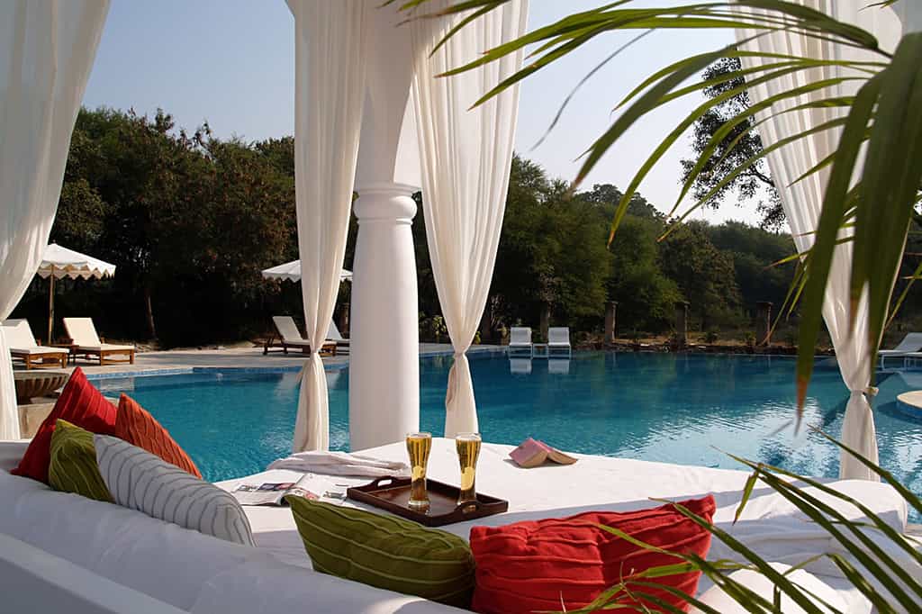 In a secluded spot surrounded by a grove of trees, the large infinity pool has underwater ledges to lounge on, cushy day beds on pavilions and a tented bar. You can also enjoy yoga sessions by the pool deck or lake as well as personalised accupressure treatments. Tuck into home-cooked Tandoori cuisine and the more continental fare in the homely dining room or out in the garden. Spot grazing cows, peacocks in full colour and the occasional blue bull poking its head out of the woods as you stroll across the lawns.