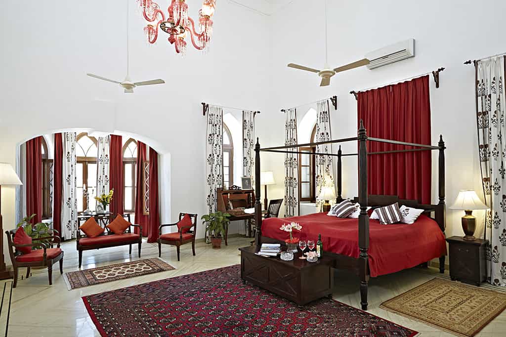 In the 45-acre garden, Shahpura offers 11 spacious suites decorated with antiques and patterned rugs, each bespoke in design. The hotel has five Royal Suites with colourful chandeliers and nature-inspired artwork, four suites, which come with a lounge area and a fireplace in the bathroom and two luxury villas with a private terrace, an outdoor shower and central courtyard. Each room comes with a king size bed, air con, tea/coffee facilities, a TV and en-suite bathroom with a deep claw-foot tub.