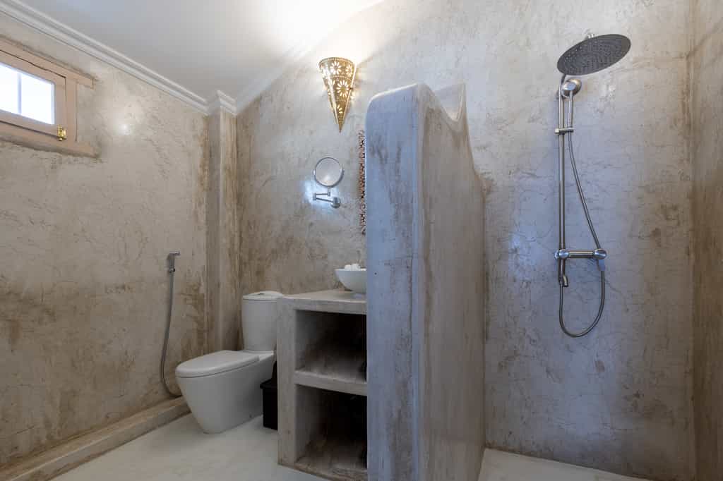 Geometric architecture invites the outdoors in. Stone floors flow seamlessly from room to room, leading out onto balconies and into open-air hallways.