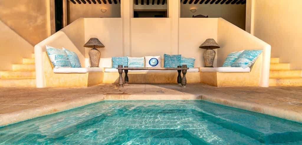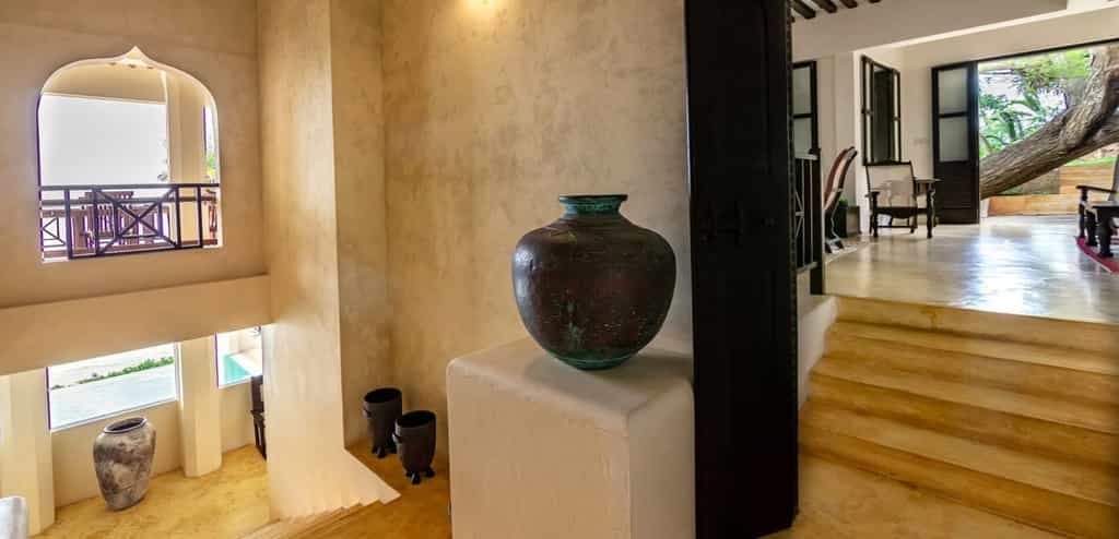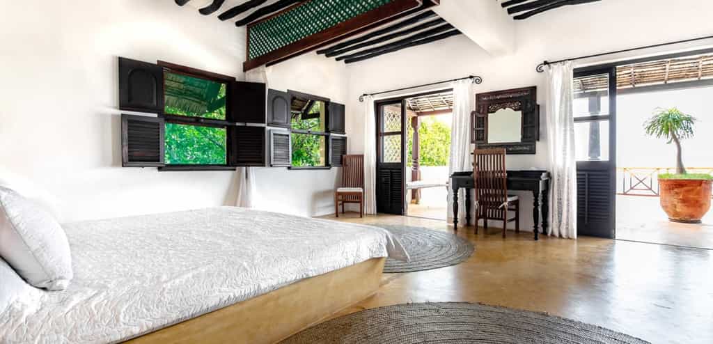 The two staircases that ascend up into the house lead to five ensuite bedrooms that together sleep between nine and eleven people. Large four poster beds with crisp white sheets contrast beautifully against the clean white interiors of the rooms. Shutter windows, repurposed furniture and stylish arabic touches make you feel like a explorer of ancient days.