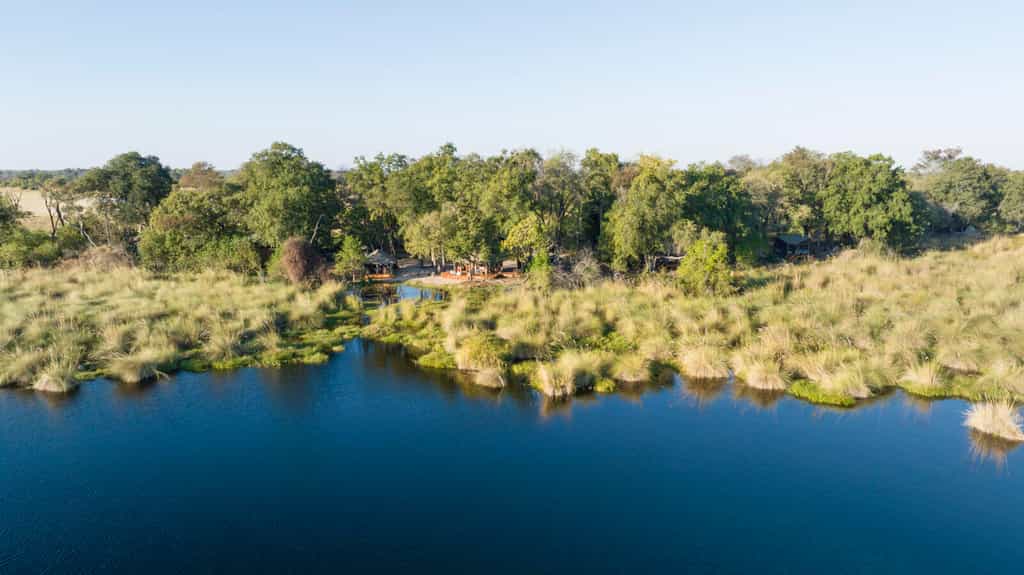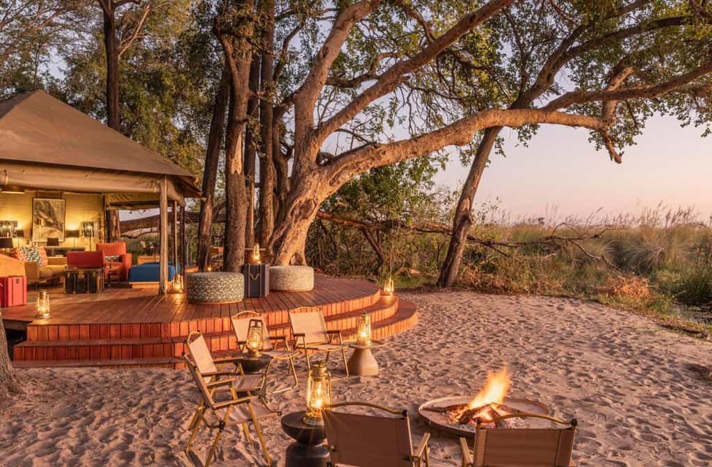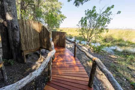 The main area takes the form of a long gazebo-style tent, with a tea and coffee station and bar at one end and a long table for dining at the other. (If you're concerned about the meals, don't be, they are terrific.) Minimalism is the key to this set-up, with no distraction or unnecessary luxuries to keep you from exploring the wilds. Outside, an elevated mound with fold-out chairs affords stunning views of the lagoon and its wildlife.