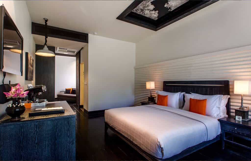 Down corridors lined with eye-catching sculptures and portraits, the rooms have a cool and collected feel. Decorated in neutral shades, each has a handsome king-sized bed with murals of the Angkor ruins mounted on the ceiling and pitch-coloured furnishings in the sitting area. The bathrooms are modern with white brick showers and Terrazzo floors. Each room has a balcony or patio, while the villa has a spacious deck with a private lap pool, dining area and alfresco stone bathtub.