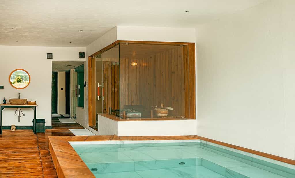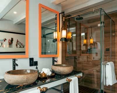All 29 suites are designed like traditional Tibetan homes with open-plan bedrooms flowing into living areas and floor-to-ceiling windows that frame the snow-dusted Nilgiris outside. Bensley's touch shows in the handmade rugs, bold splashes of colour against warm wood, and the Robert Powell artworks on the walls. Top Floor Suites have higher ceilings and bathtubs facing the mountains, while the Balcony Suites have an added private outdoor perch for evening stargazing. Every suite includes a refillable minibar, organic local toiletries and copper Tibetan boxes in place of plastic bottles.