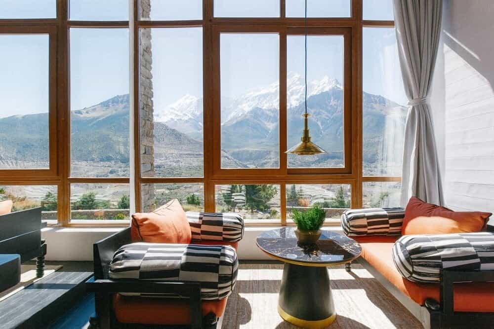 Built from local Baglung stone and almost camouflaged into the mountainside, the lodge's interiors are classic Bensley – antique furniture, vibrant Tibetan textiles and artworks by Nepali painter Dhwoj Gurung adorning the walls. The Nilgiri Restaurant serves a different themed menu each evening (the nine-course momo tasting is legendary), while the Aara Bar, lined with yak fur and local handicrafts, is the sort of place where a post-hike cocktail comes with views of 7,000-metre peaks. Outside, fire pits provide a warming spot to gaze at the stars.