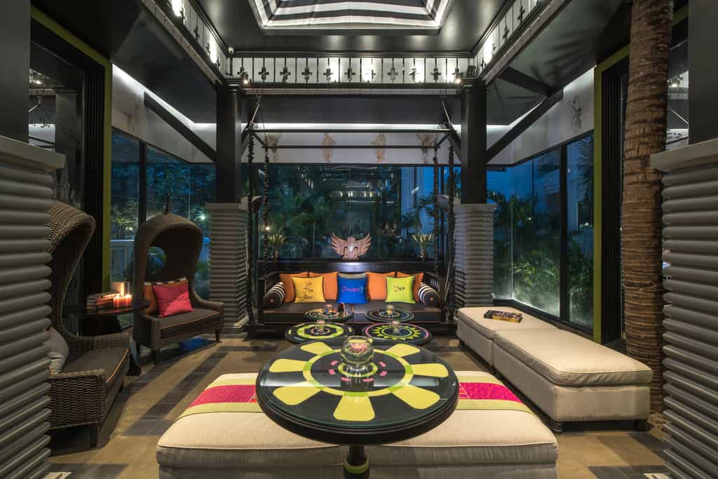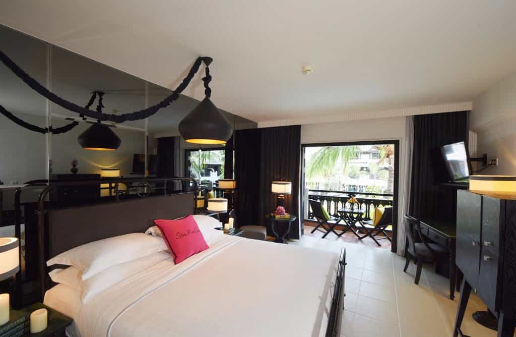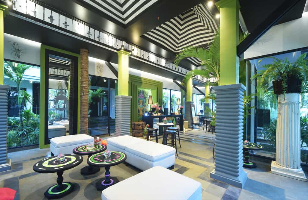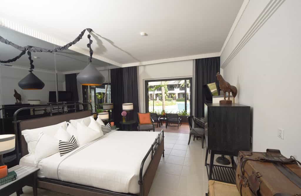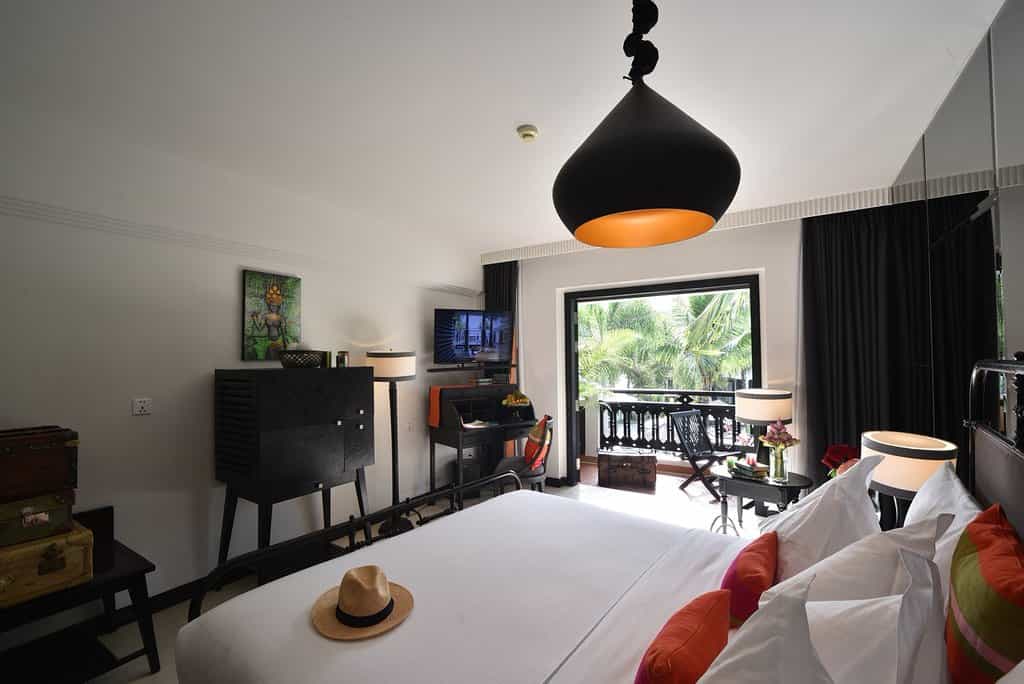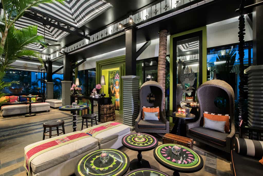 Clustered around the courtyard pool, each uniquely-designed room is bedecked with eye-popping portraits and murals. The look is an interesting blend of heavy, dark wood furnishings, Khmer carvings and industrial-style fixtures from wrought iron bed frames to warehouse lamps. The bathrooms are minimalist with a bathtub and rain shower; and other amenities include a TV, tea/coffee maker and minibar. The spacious suites have an adjoining lounge area in shades of mustard or orange and geometric carpeting.