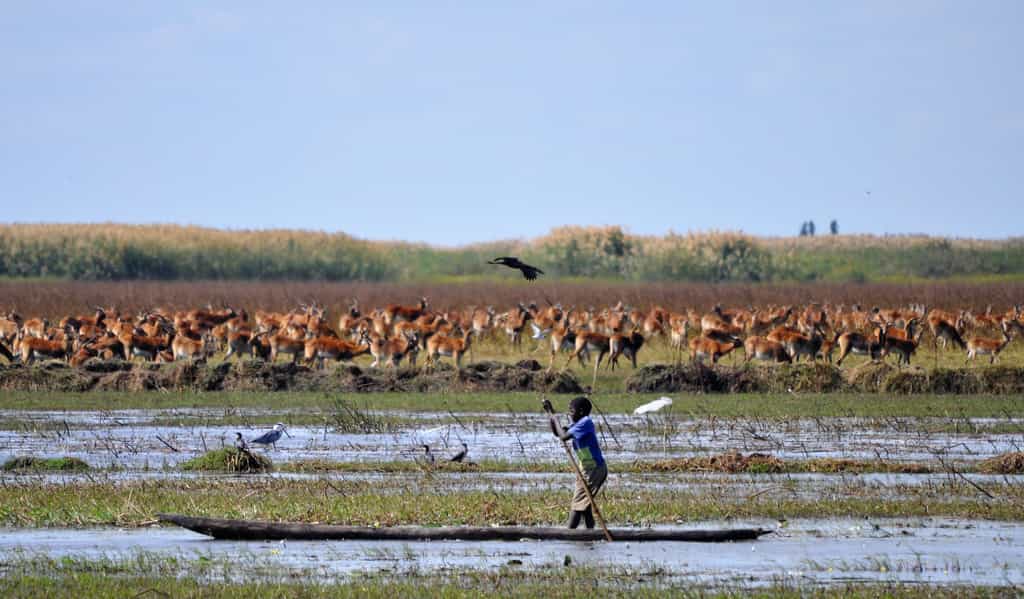 Completely re-built, the camp is located on the west side of the wetlands on the same small island but repositioned to maximize views from a luxurious lodge deck overlooking a main lake. Positioned right on the high flood line in a grove of trees, the camp¹s main area opens entirely to the vast plains with lechwe and flocks of diverse waterbirds within arm's reach. Each of the camps 4 tents (2 double, 2 twin) are set back on the island, and appointed with the most luxurious linens and creature comforts. Designed to appeal to a broad audience of "not just birders", Shoebill offers walking, deep hull (photographic) canoeing, mokoro as well as genuine and impromptu community visits with the seasonal fishermen of the region. Our Shoebill Guardian program ensures that Shoebills are nearly always discovered, and in particular during nesting season (June to October).