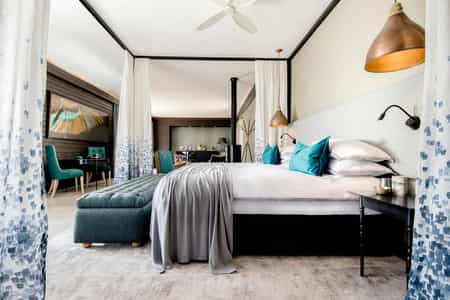 The six suites are positively palatial, with sleek, modern interiors, refined furnishings brightened with rich touches of colour, and a clear focus on privacy and comfort. The beds are vast and deep, with mosquito netting to protect you at night. At the rear, the large bathroom has a walk-in shower, a deep bath, and exceptional fittings. The two elegant seating areas are serviced by a well-equipped coffee bar and minibar. The larger family unit has two bedrooms with en-suite bathrooms.