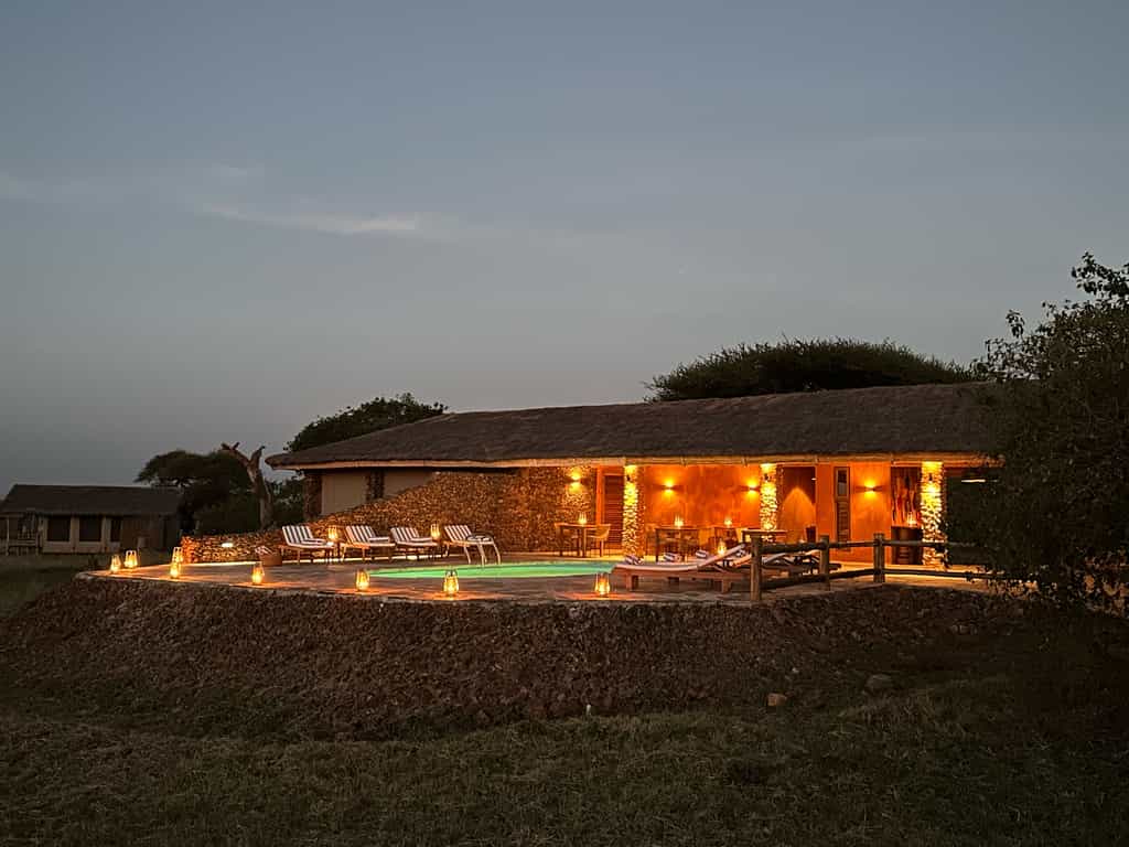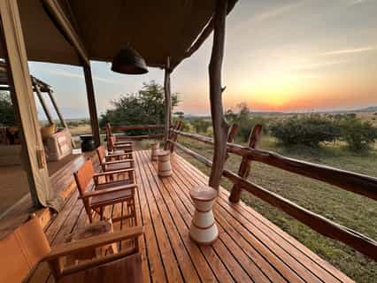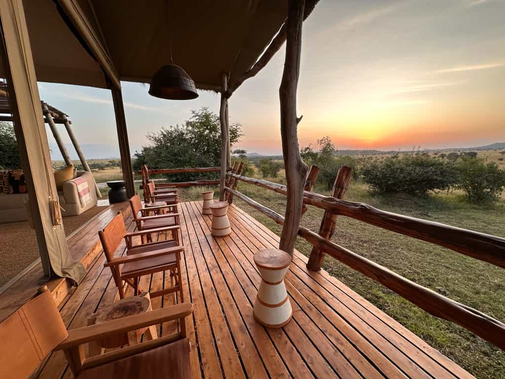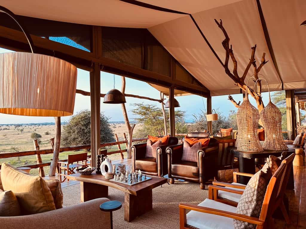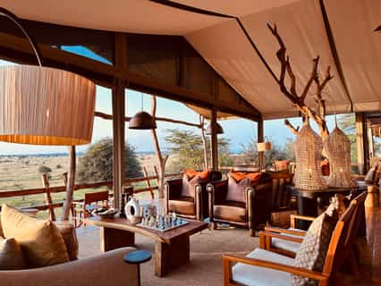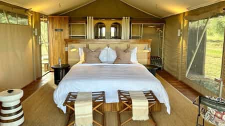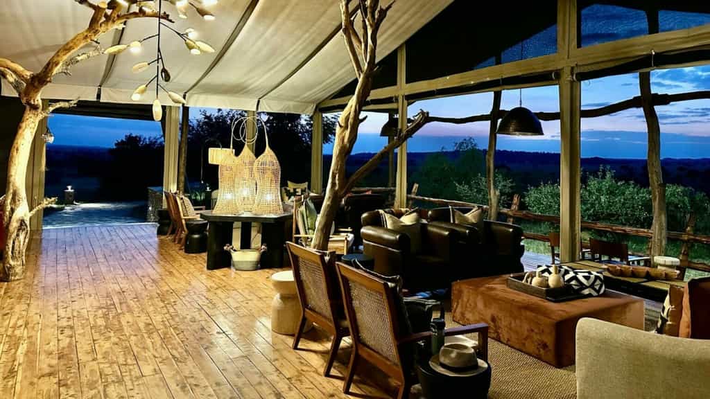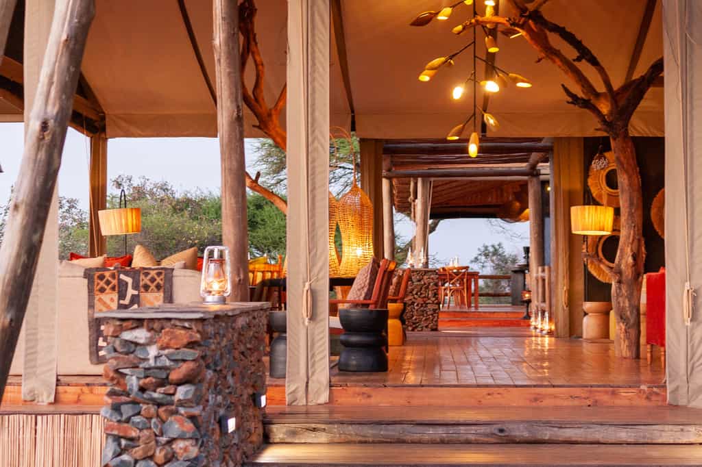 The tented suites provide a haven of comfort, blending the thrill of sleeping under canvas with lodge-style luxuries. Each suite boasts plush bedding, woven rugs, and en-suite bathrooms with eco-friendly showers and solar-heated water. Large screens open up to reveal the rolling plains, allowing guests to feel as if they’re part of the wilderness while maintaining privacy and a sense of style.